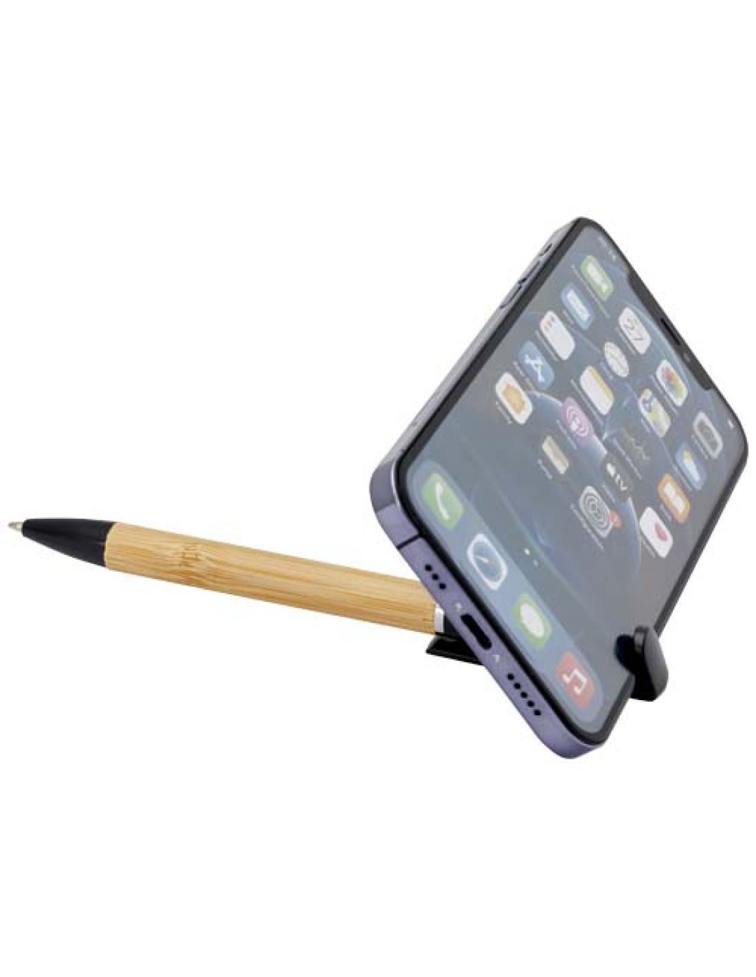 Bolígrafo de bambú que también funciona como soporte para el teléfono. El botón y el anillo central están hechos de plástico reciclado, la punta es de latón y el cuerpo de bambú de origen responsable. Color de la tinta: Negro. Longitud de escritura: 1000 metros. Tamaño del plumín: 1,0 mm.