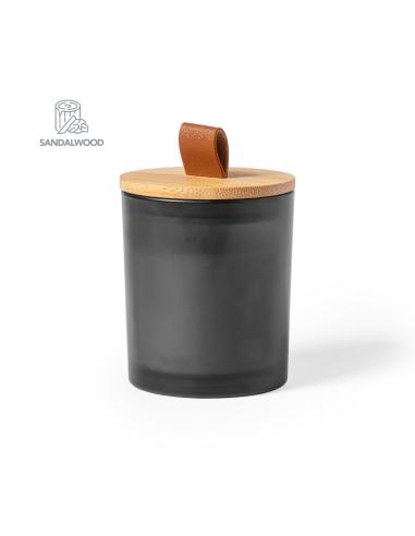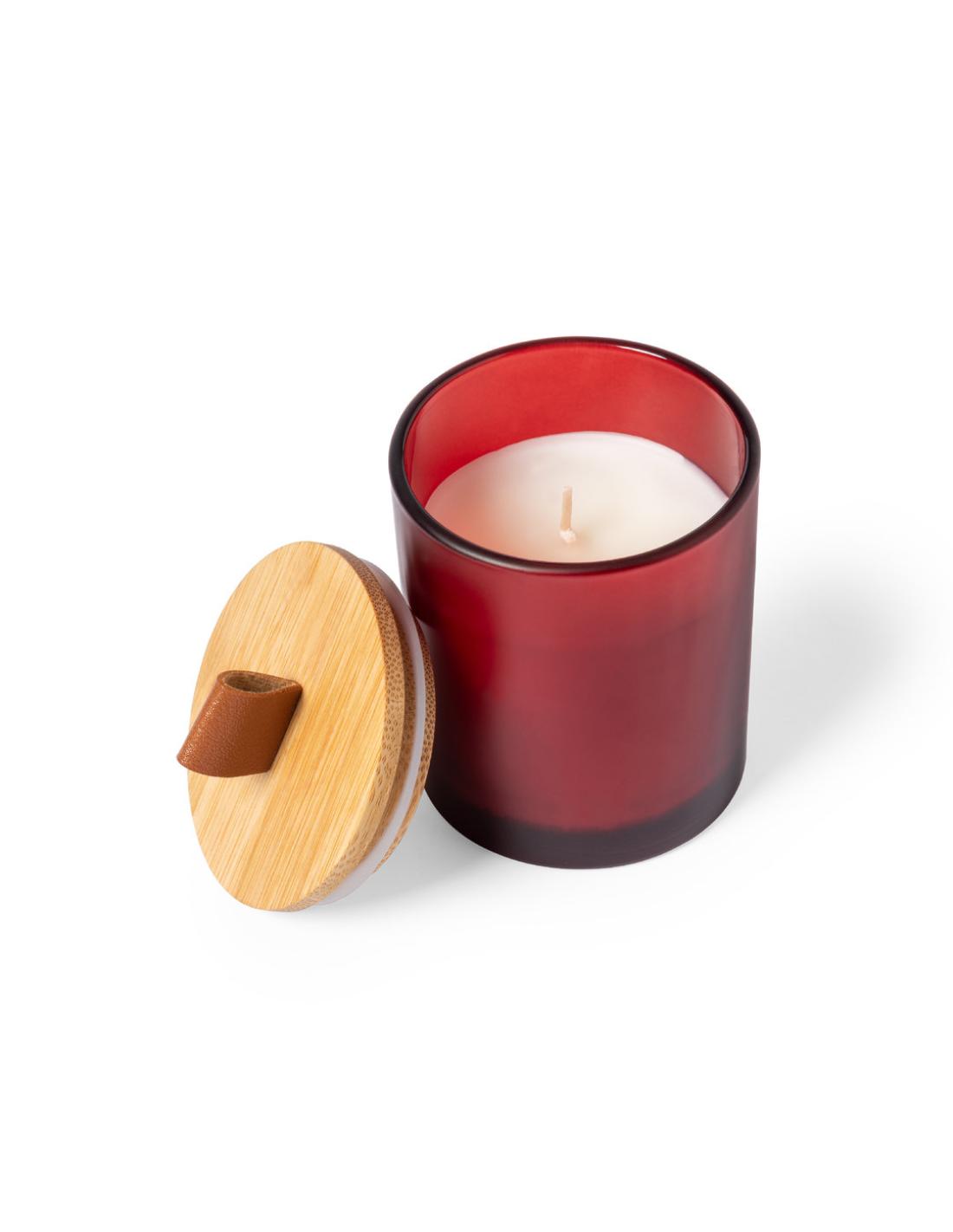 Vela aromática en tarrito de cristal con tapa de bambú. Disponible en cristal de variados colores y con distintos aromas según el color:Blanco aroma vainilla. Negro aroma sándalo. Rojo aroma canela.Verde aroma jazmín. Presentada en caja individual de diseño kraft.