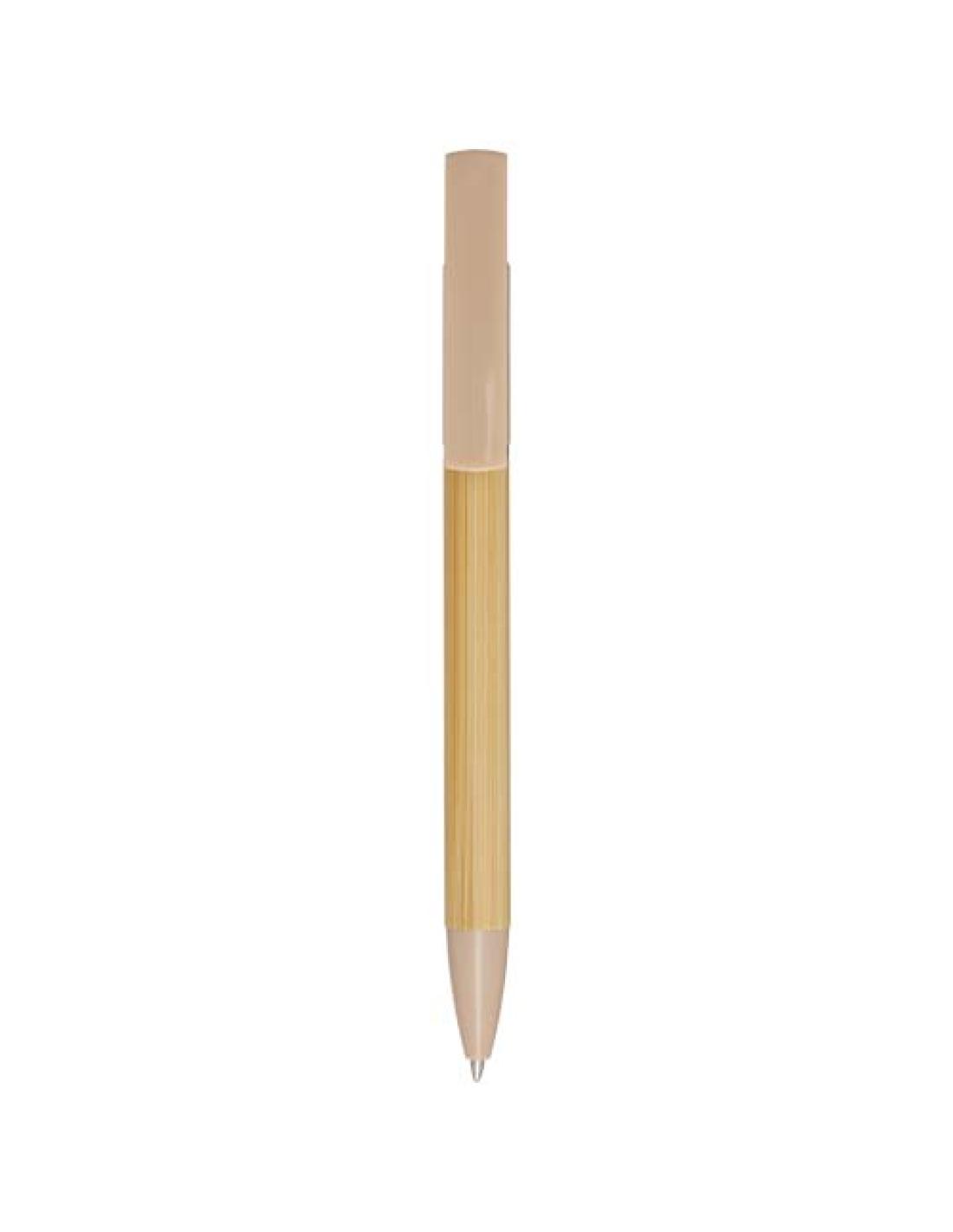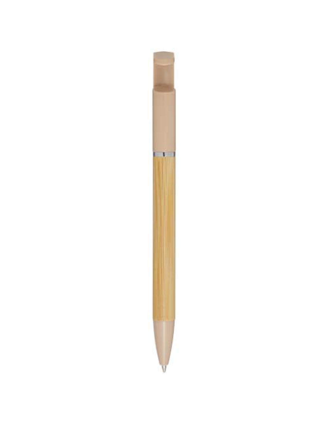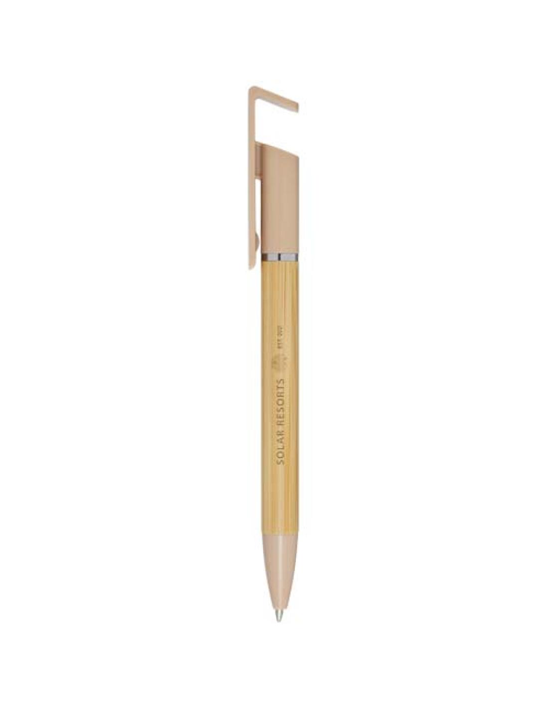 Bolígrafo de bambú que también funciona como soporte para el teléfono. El botón y el anillo central están hechos de plástico reciclado, la punta es de latón y el cuerpo de bambú de origen responsable. Color de la tinta: Azul. Longitud de escritura: 1000 metros. Tamaño del plumín: 1,0 mm.