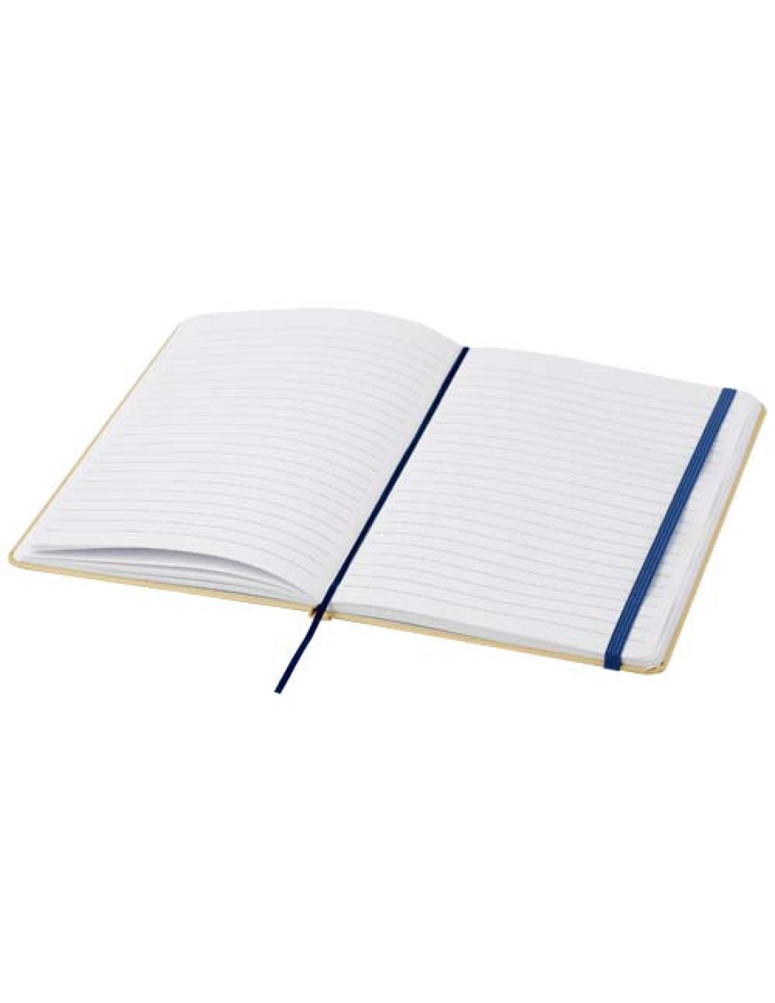 Libreta A5 de tapa dura de cartón reciclado con 80 hojas rayadas de papel de 70 g/m². La libreta tiene un cierre elástico, una cinta y esquinas redondeadas.