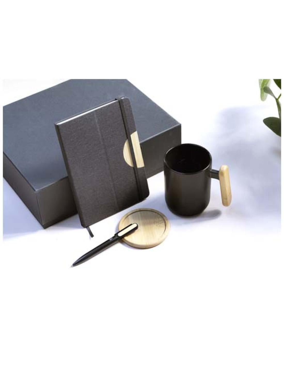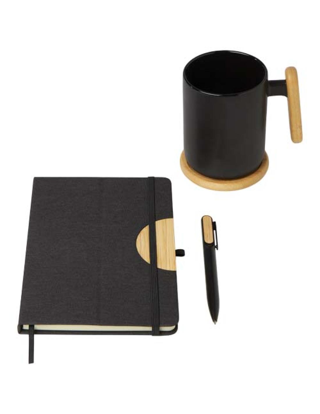 El set de regalo "Laura" incluye una libreta de tapa dura RPET A5, un bolígrafo, una taza de cerámica y un posavasos. La libreta tiene un cierre elástico negro, una cinta marcapáginas y 80 hojas rayadas de color crema de papel de 80 g/m². La tapa de la libreta, junto con el semicírculo de bambú, sirve de soporte para teléfono. El bolígrafo está fabricado en aluminio reciclado con certificación RCS con un revestimiento negro pulverizado y accesorios de bambú a ambos lados de la parte superior del cuerpo. Tinta del bolígrafo: Negro. Longitud de escritura: 400 metros. La taza de cerámica de 480 ml incluye un posavasos de bambú. Lavar a mano únicamente. Tamaño de la taza: 11 × 12,7 cm. Diámetro del posavasos: 9,5 cm. Tamaño de la caja de regalo: 32 × 27 × 10,3 cm.