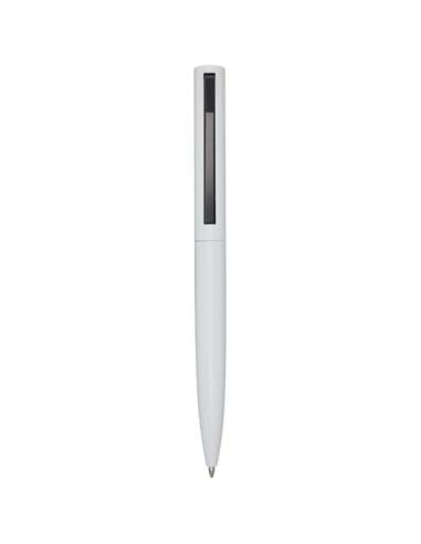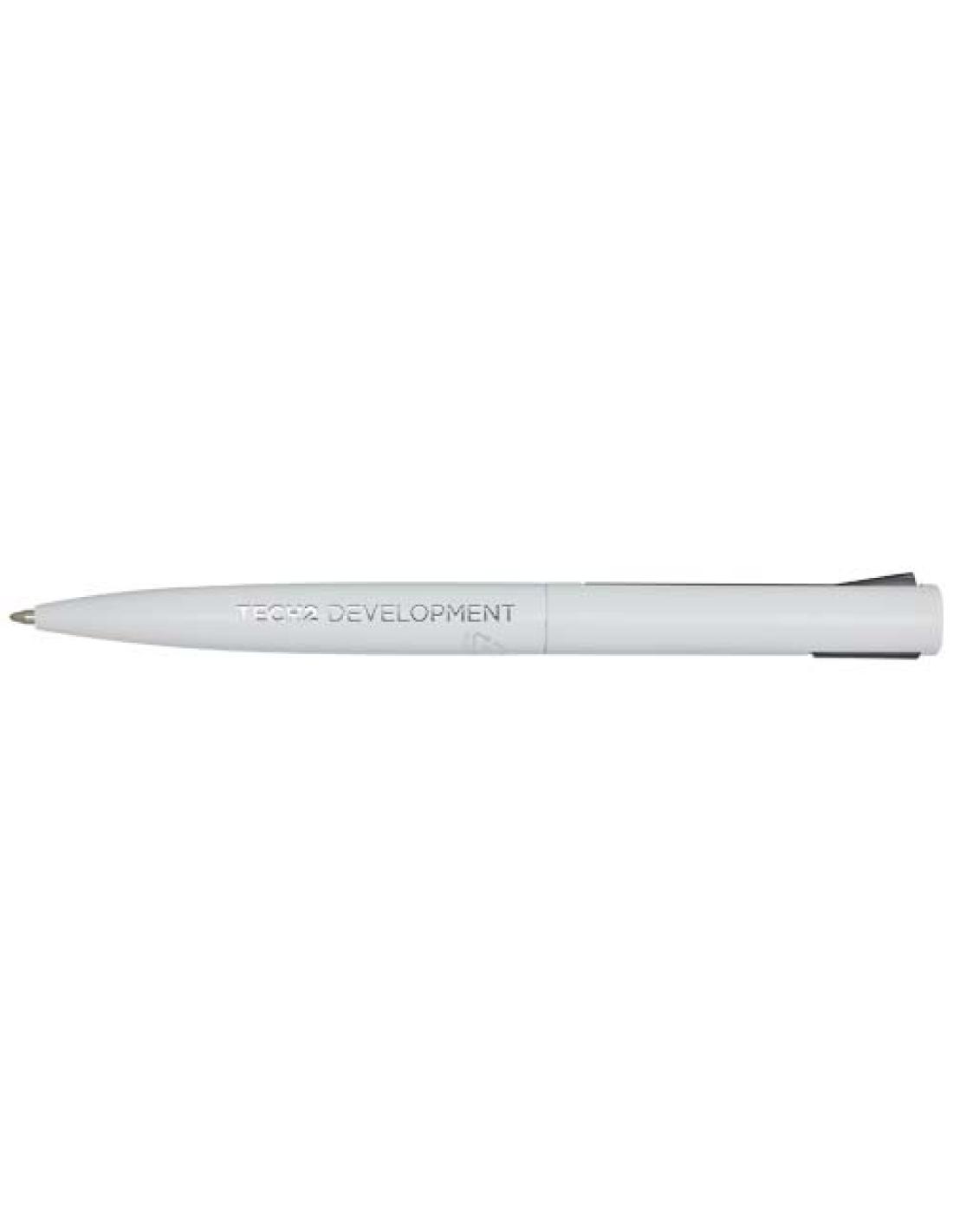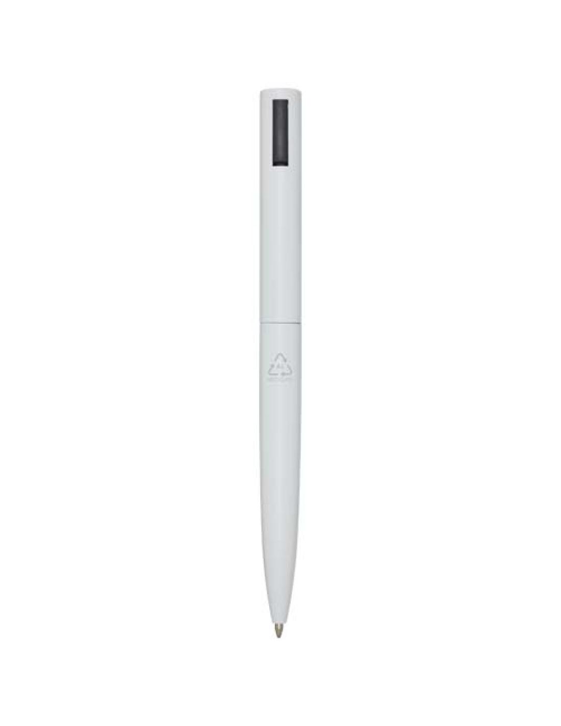 Bolígrafo con la parte superior del cuerpo de plástico reciclado y la parte inferior de aluminio reciclado. El clip es de hierro. Color de la tinta: Azul. Longitud de escritura: 1000 metros. Tamaño del plumín: 1,0 mm.