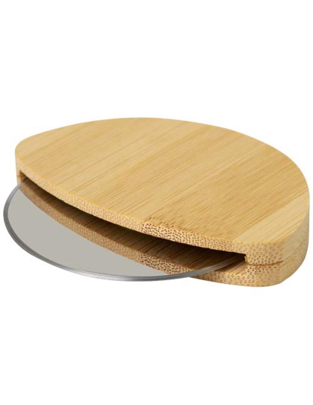 Cortador de pizza con mango de bambú y cuchilla de acero inoxidable.
