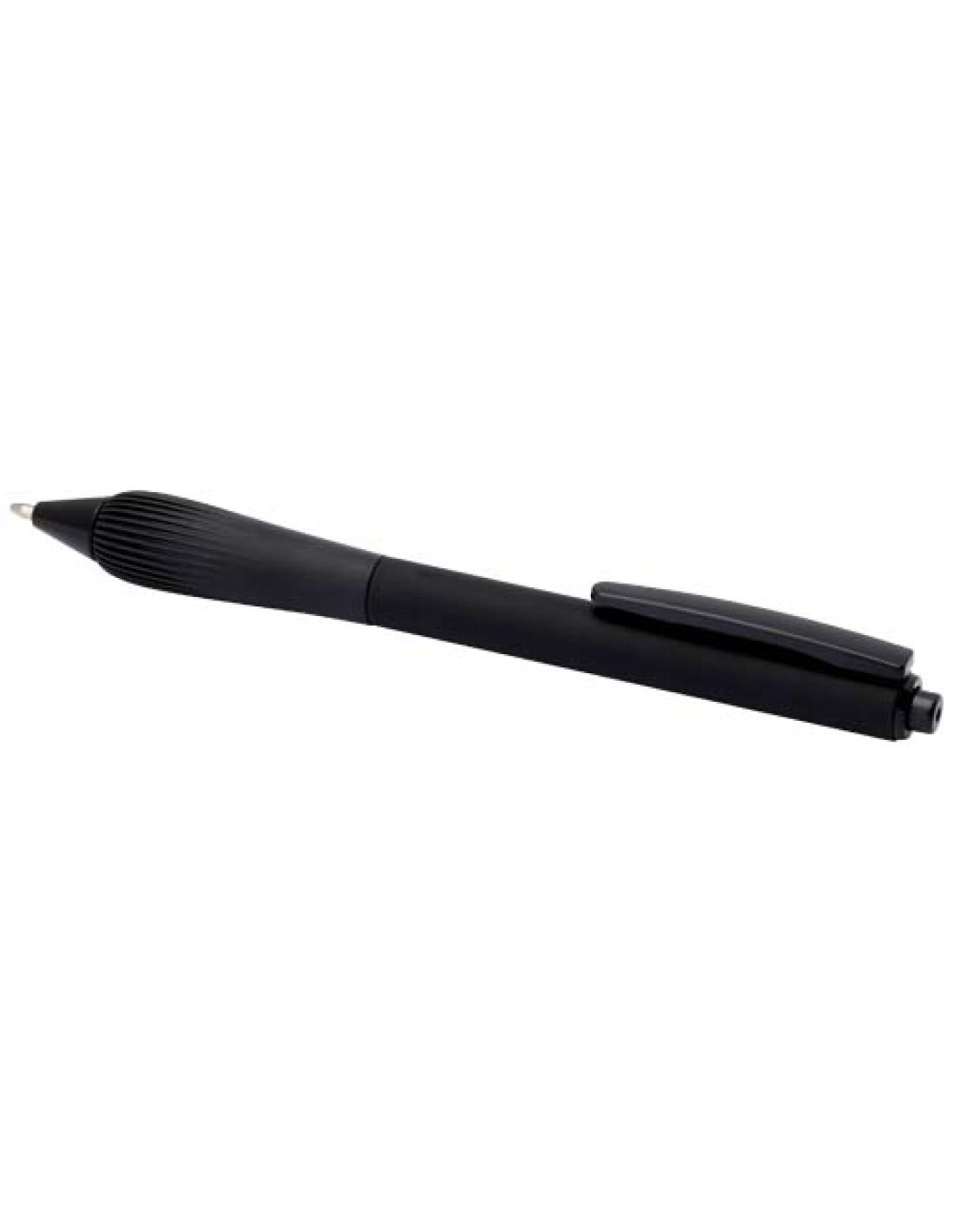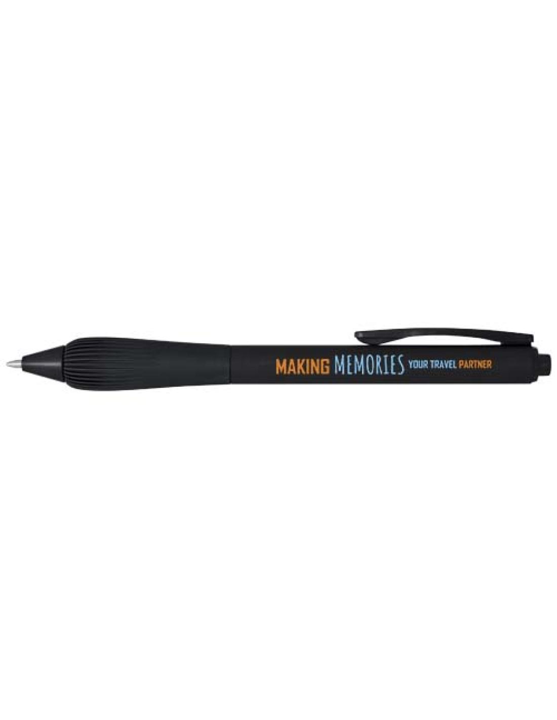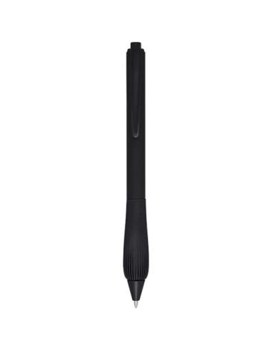 Bolígrafo de plástico reciclado con cuerpo recubierto de goma y empuñadura de TPR. Color de la tinta: Negro. Longitud de escritura: 1000 metros. Tamaño del plumín: 1,0 mm.