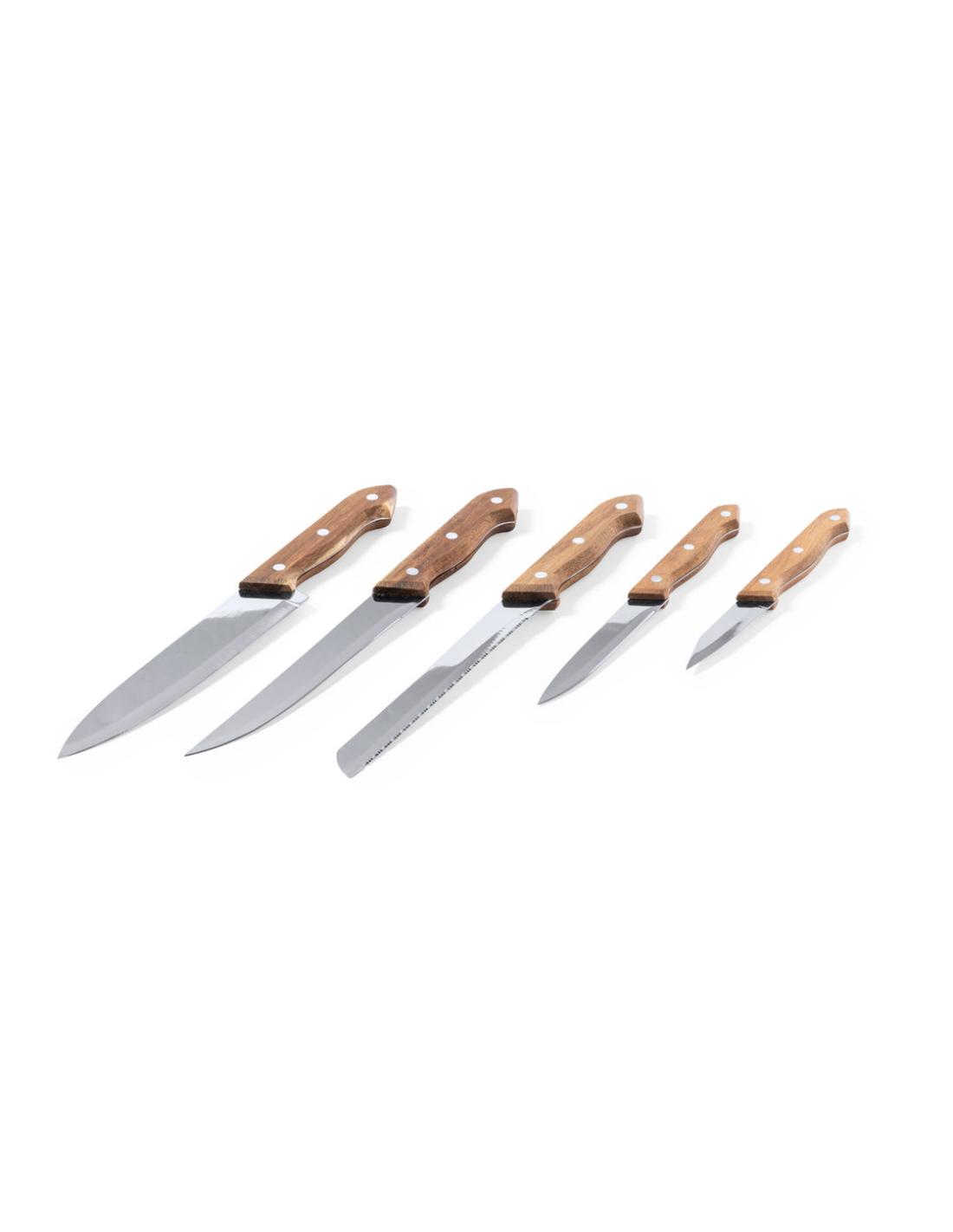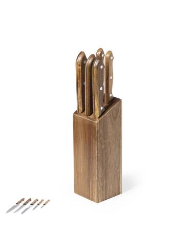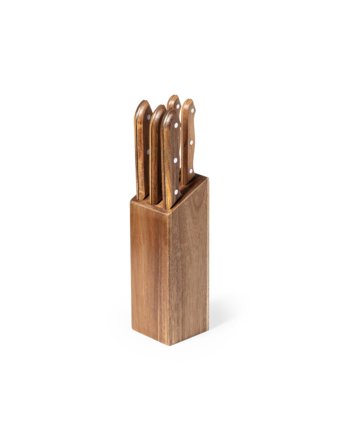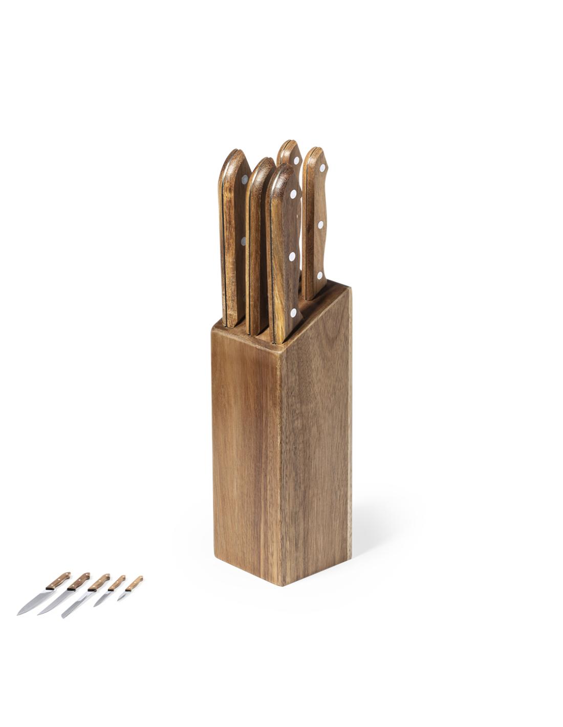 Completo tacoma con base fabricada en resistente madera natural de acacia. Incluye 5 cuchillos en distintos tamaños y para distintos usos, fabricados en acero inox, con mango en madera de acacia. Presentación en caja individual de diseño kraft