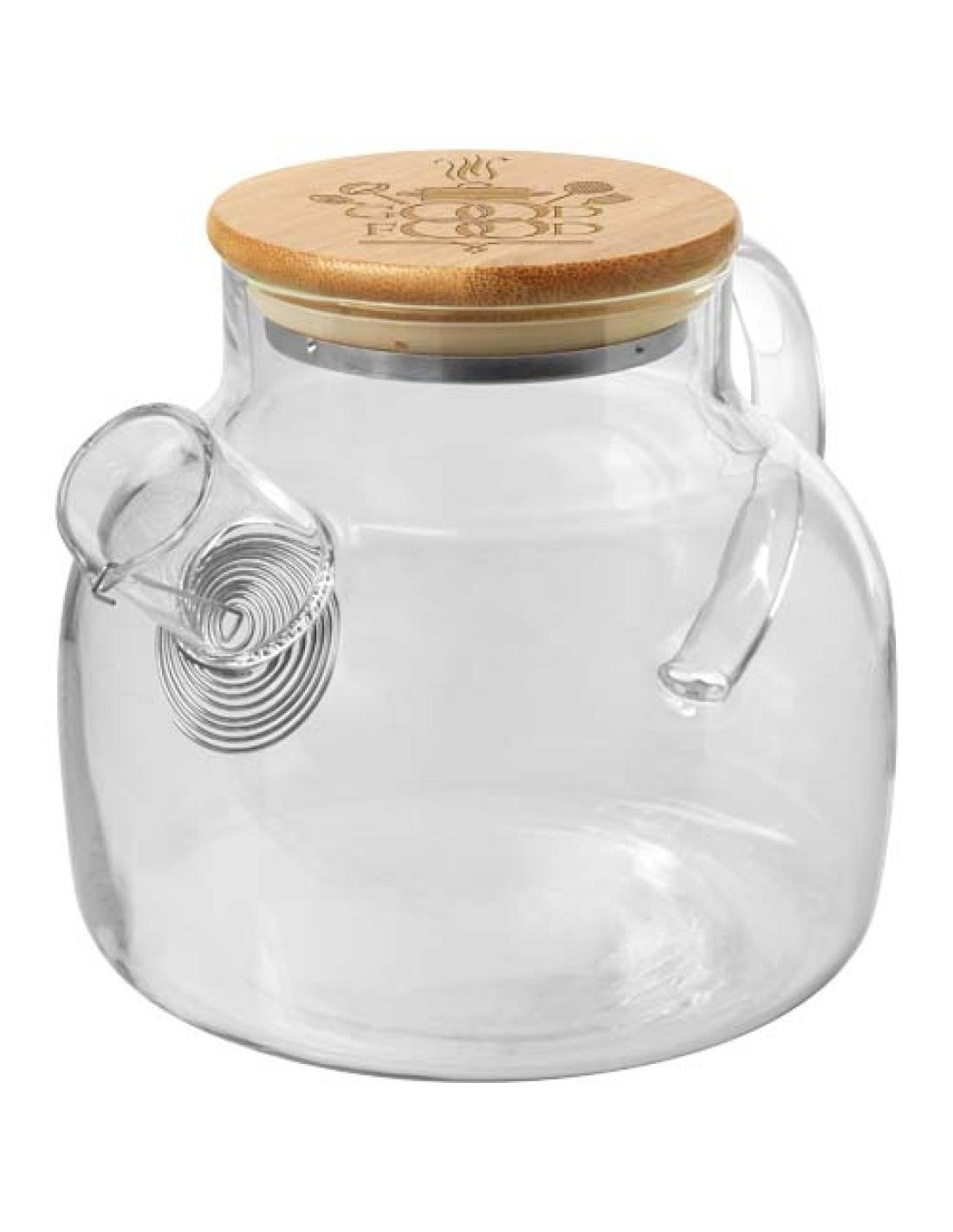 Tetera de vidrio borosilicato con tapa de bambú y filtro para té de acero inoxidable. Debido a las características del bambú, el color puede variar ligeramente. Capacidad: 1000 ml.
