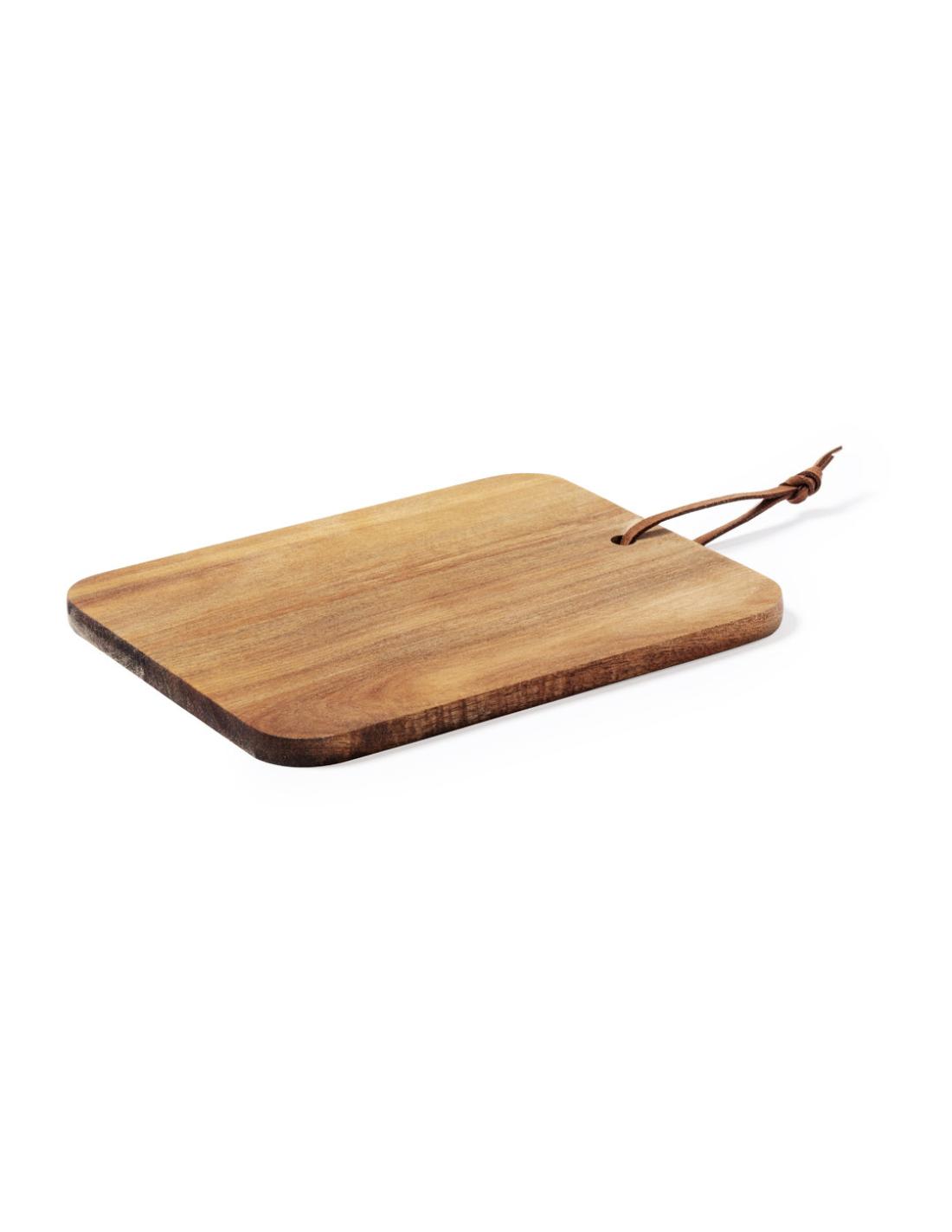 Tabla de corte y presentación fabricada en madera natural. En formato rectangular, con cordón en resistente polipiel a juego.