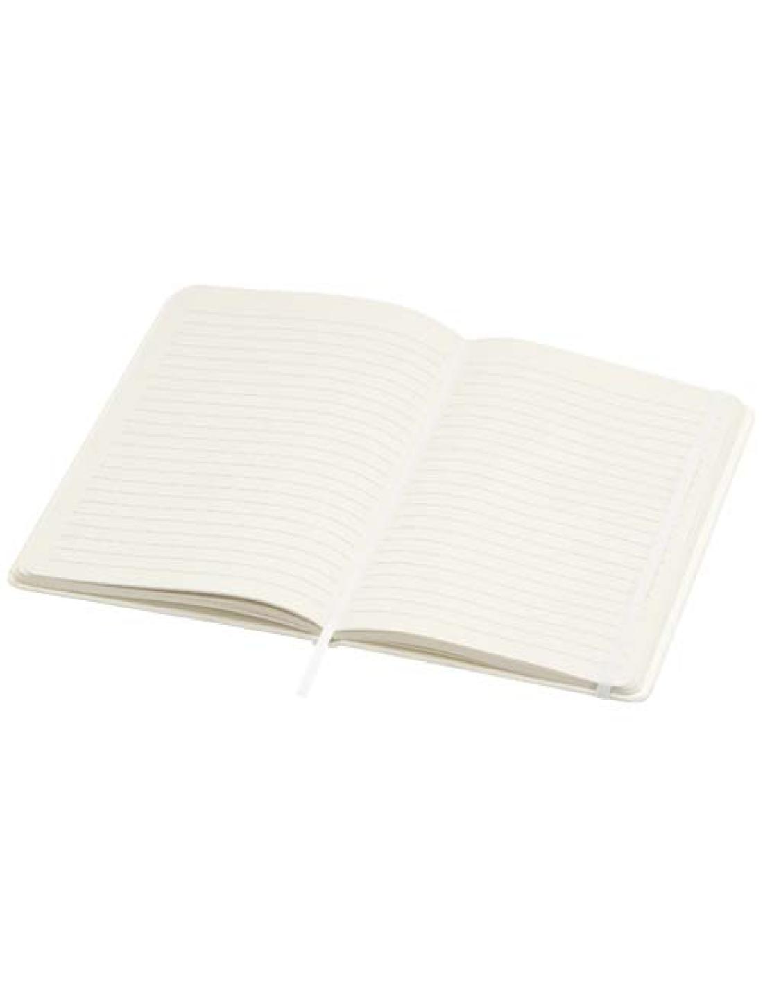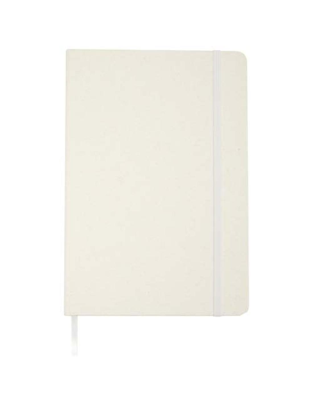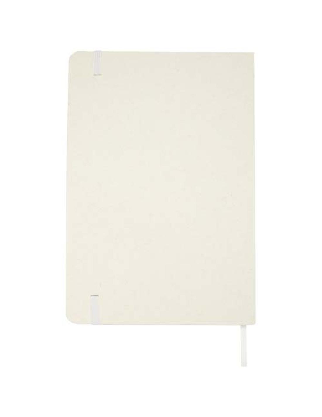 La libreta de tapa dura "Bass" A5 incluye 80 hojas rayadas de papel de 80 g/m2 y está fabricada con cartones de leche reciclados.