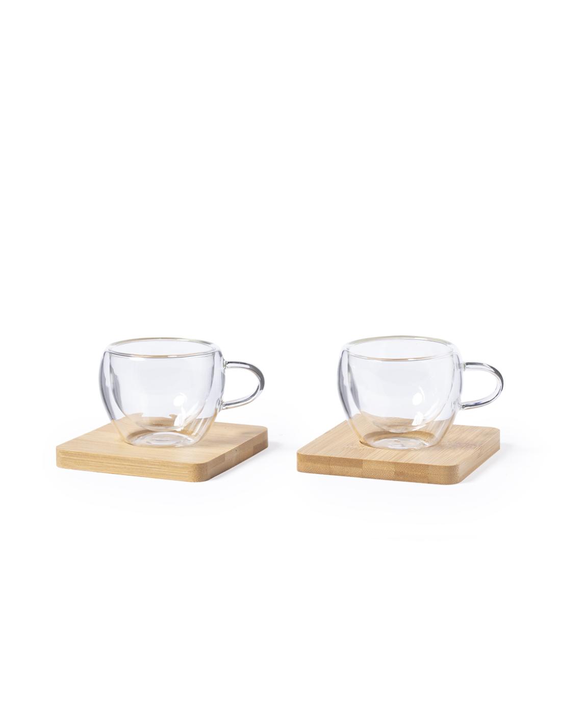Dos tazas de vidrio de doble pared de 100 ml con posavasos de bambú N10413311