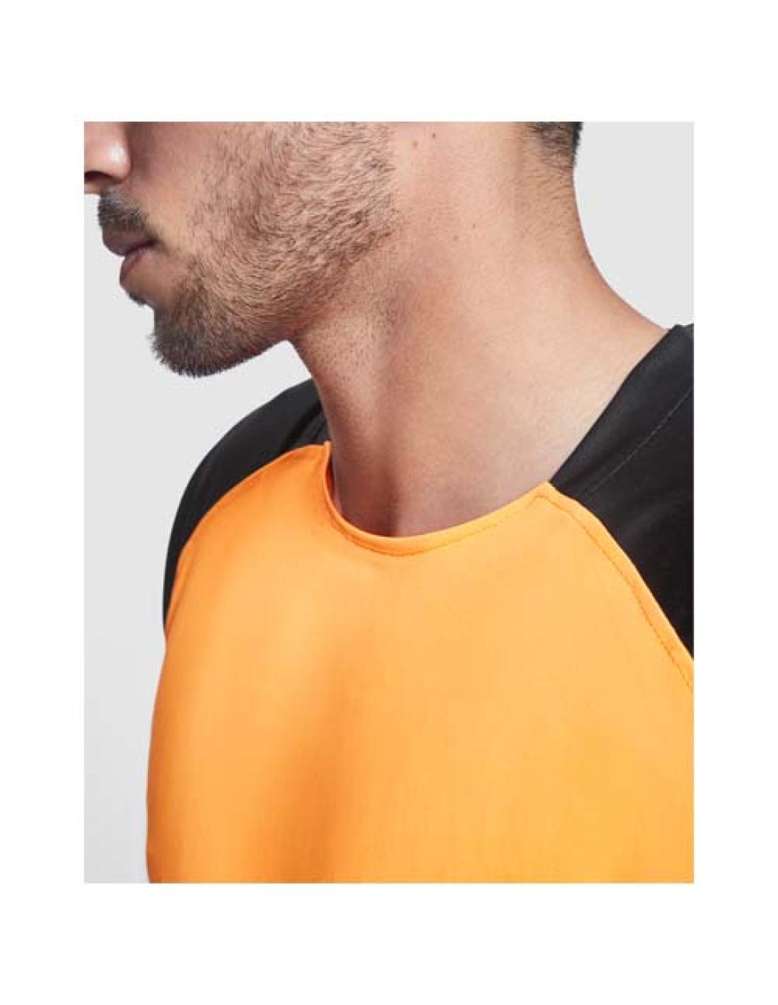 Tejido técnico y transpirable. Cuello redondo con costuras cubiertas a juego. Mangas raglán y paneles laterales en contraste. Etiqueta extraíble.