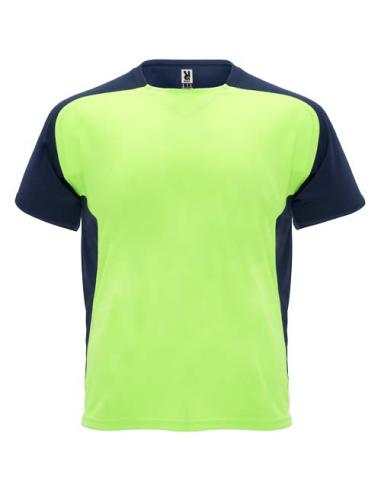 Tejido técnico y transpirable. Cuello redondo con costuras cubiertas a juego. Mangas raglán y paneles laterales en contraste. Etiqueta extraíble.