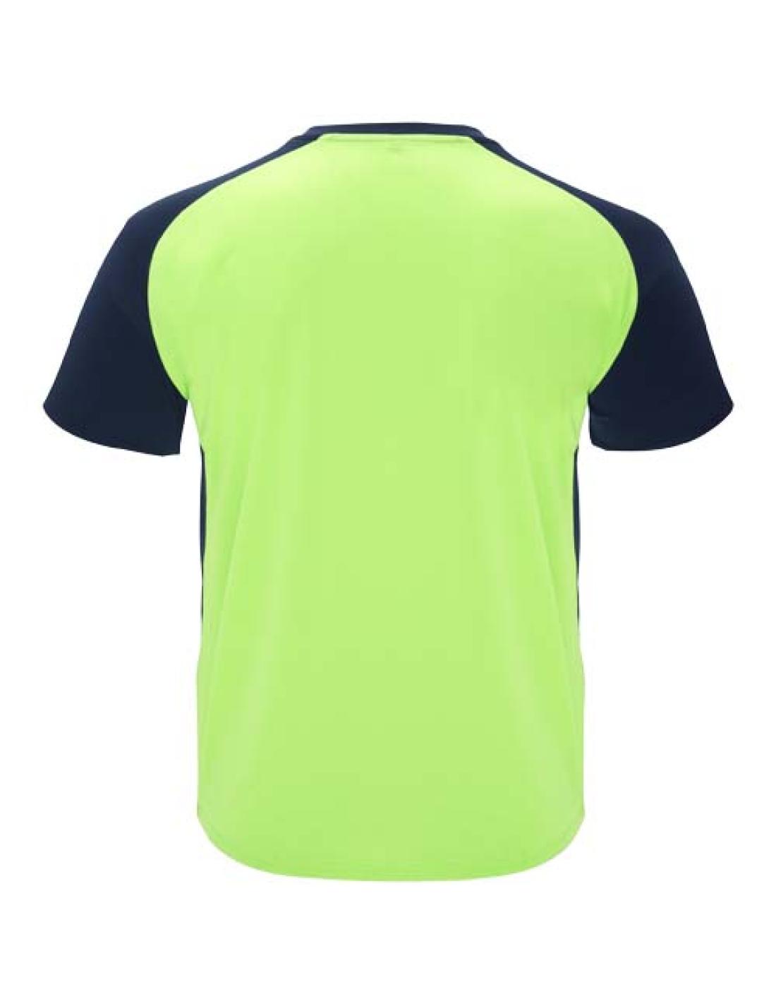 Tejido técnico y transpirable. Cuello redondo con costuras cubiertas a juego. Mangas raglán y paneles laterales en contraste. Etiqueta extraíble.