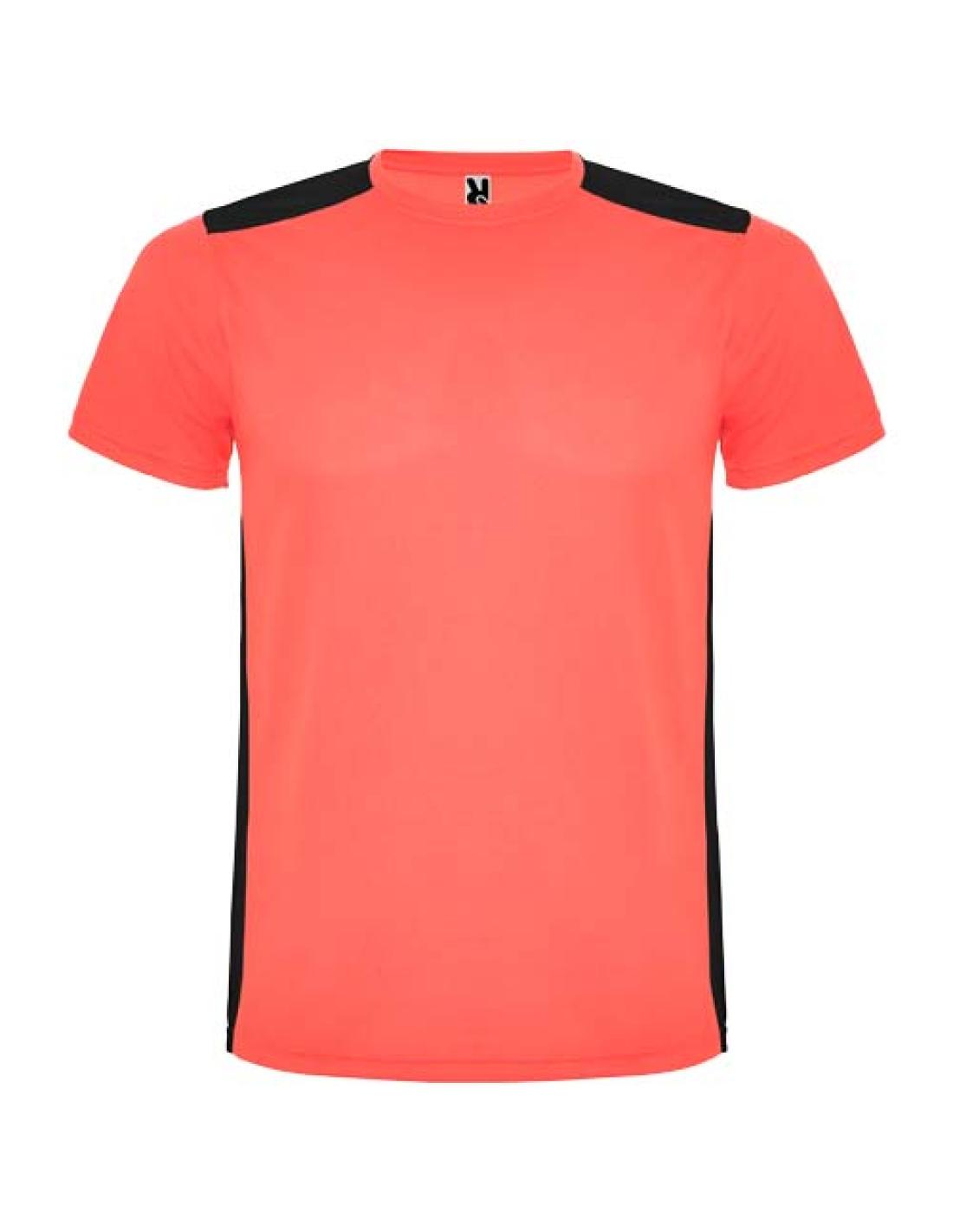 Tejido técnico y transpirable de fácil secado. Cuello redondo. Combinación de dos tejidos de poliéster en la espalda y los hombros. Tejido ojo de perdiz en la parte delantera y tejido de malla 3D transpirable en la parte trasera. Tejido preparado para absorber la humedad. Pespunte decorativo en zigzag en los costados y los hombros. Patrón trasero ligeramente más largo. Etiqueta extraíble.