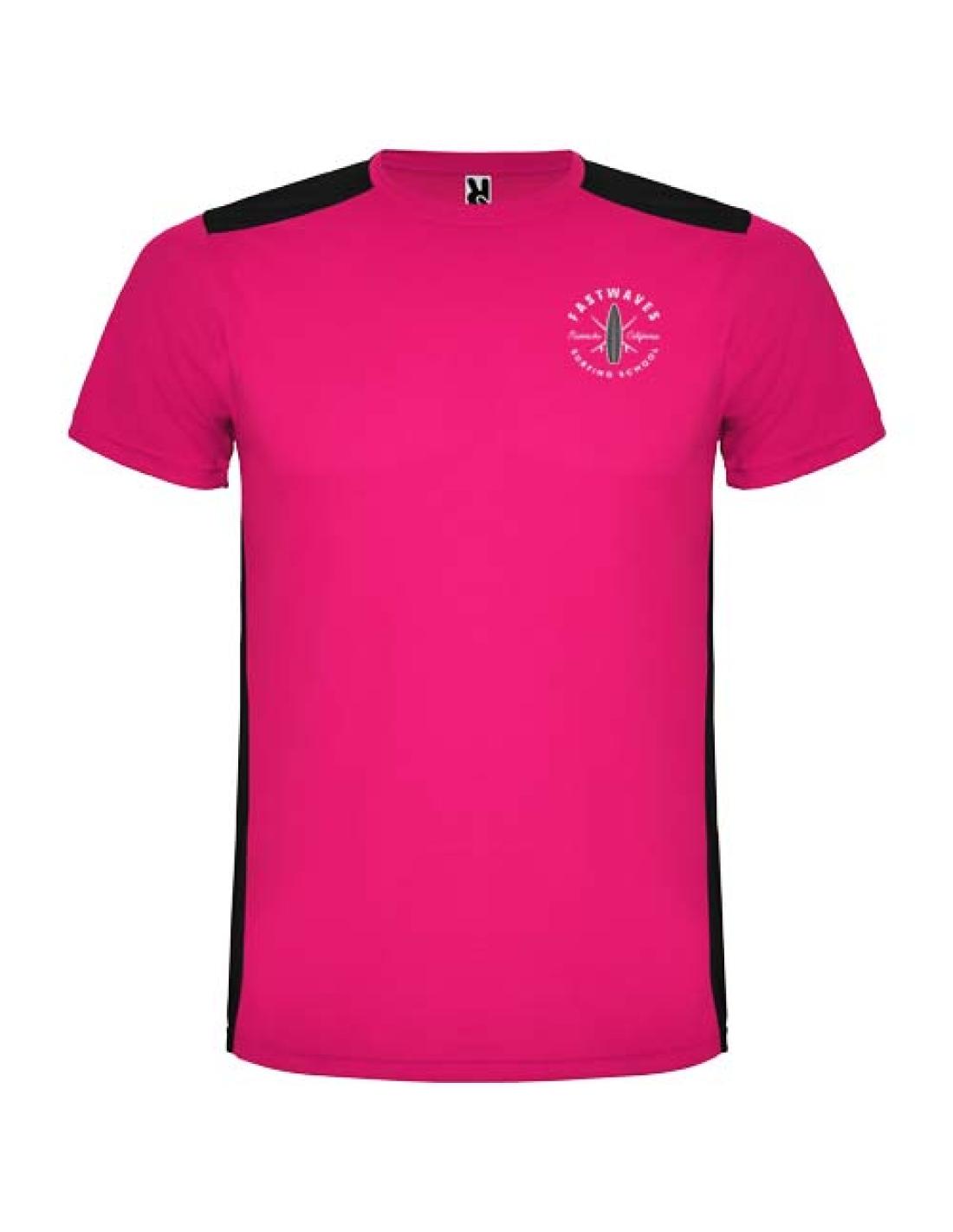 Tejido técnico y transpirable de fácil secado. Cuello redondo. Combinación de dos tejidos de poliéster en la espalda y los hombros. Tejido ojo de perdiz en la parte delantera y tejido de malla 3D transpirable en la parte trasera. Tejido preparado para absorber la humedad. Pespunte decorativo en zigzag en los costados y los hombros. Patrón trasero ligeramente más largo. Etiqueta extraíble.