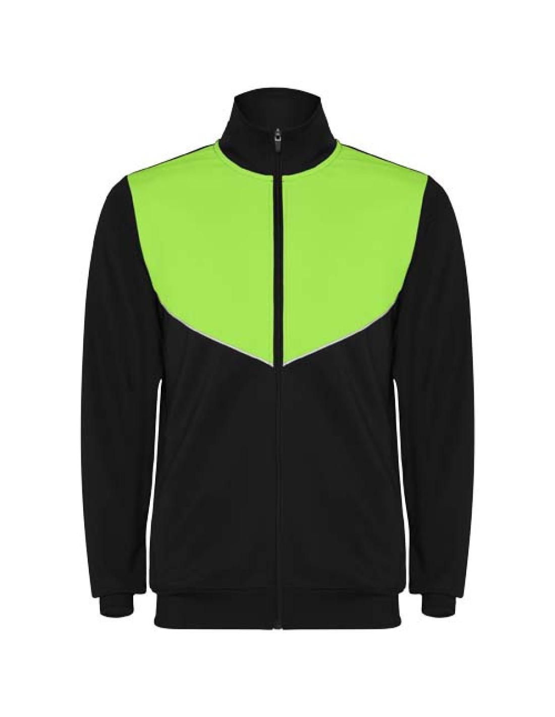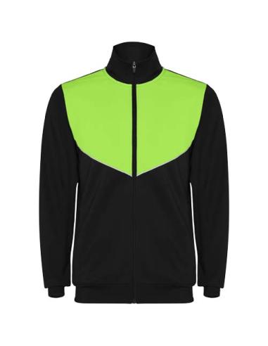 Chándal de tejido ligero y elástico. Chaqueta con color contrastado y ribetes de costura en el pecho. Cuello alto con costuras en contraste. Cremallera delantera central. Bolsillos laterales. Puños y cintura de canalé 2 × 2. Pantalón con cintura elástica y cordón. Pieza lateral en contraste con ribete de costura. Dobladillo con cremallera.