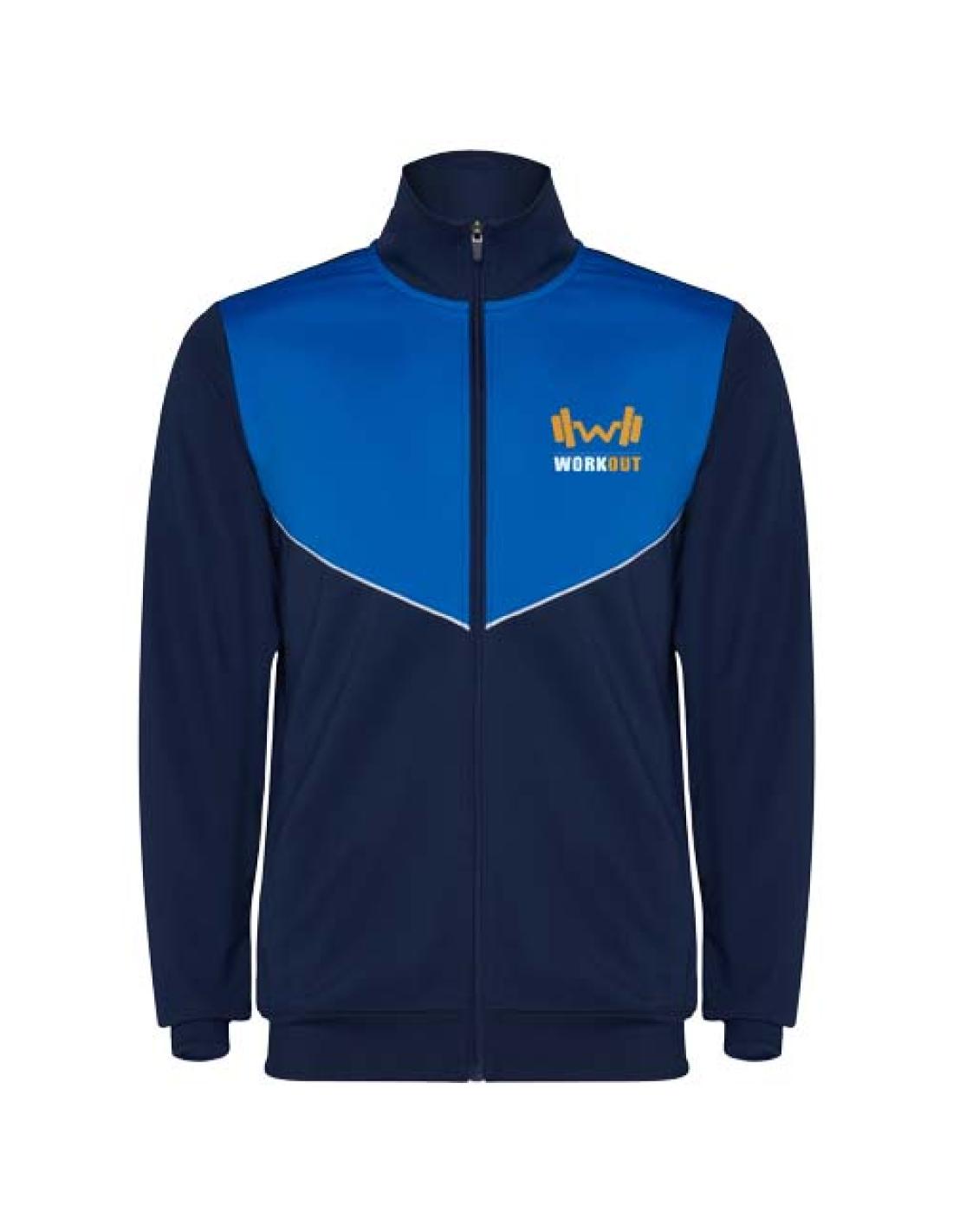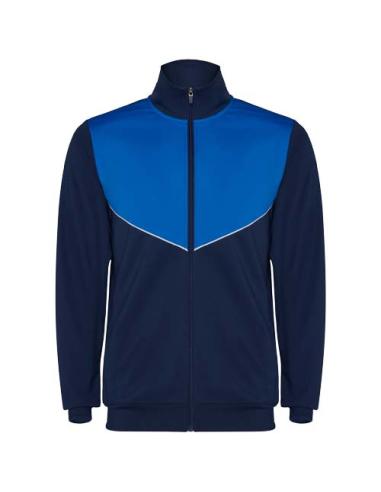 Chándal de tejido ligero y elástico. Chaqueta con color contrastado y ribetes de costura en el pecho. Cuello alto con costuras en contraste. Cremallera delantera central. Bolsillos laterales. Puños y cintura de canalé 2 × 2. Pantalón con cintura elástica y cordón. Pieza lateral en contraste con ribete de costura. Dobladillo con cremallera.