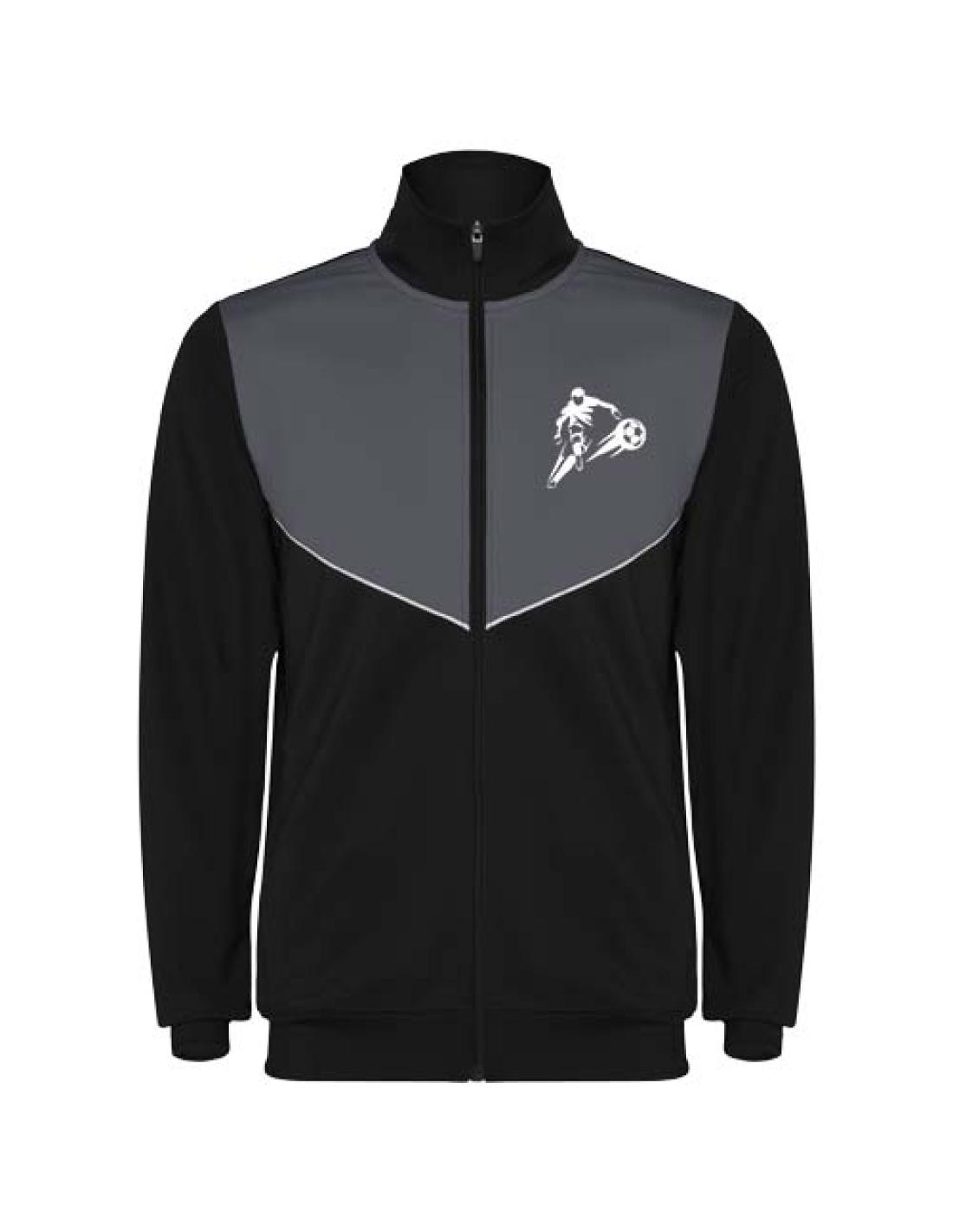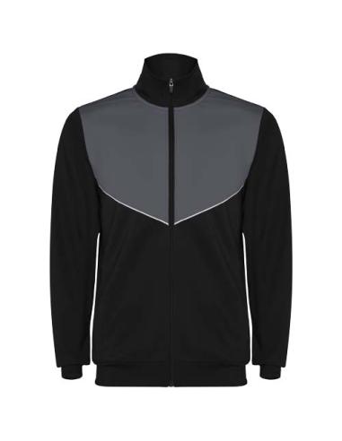 Chándal de tejido ligero y elástico. Chaqueta con color contrastado y ribetes de costura en el pecho. Cuello alto con costuras en contraste. Cremallera delantera central. Bolsillos laterales. Puños y cintura de canalé 2 × 2. Pantalón con cintura elástica y cordón. Pieza lateral en contraste con ribete de costura. Dobladillo con cremallera.