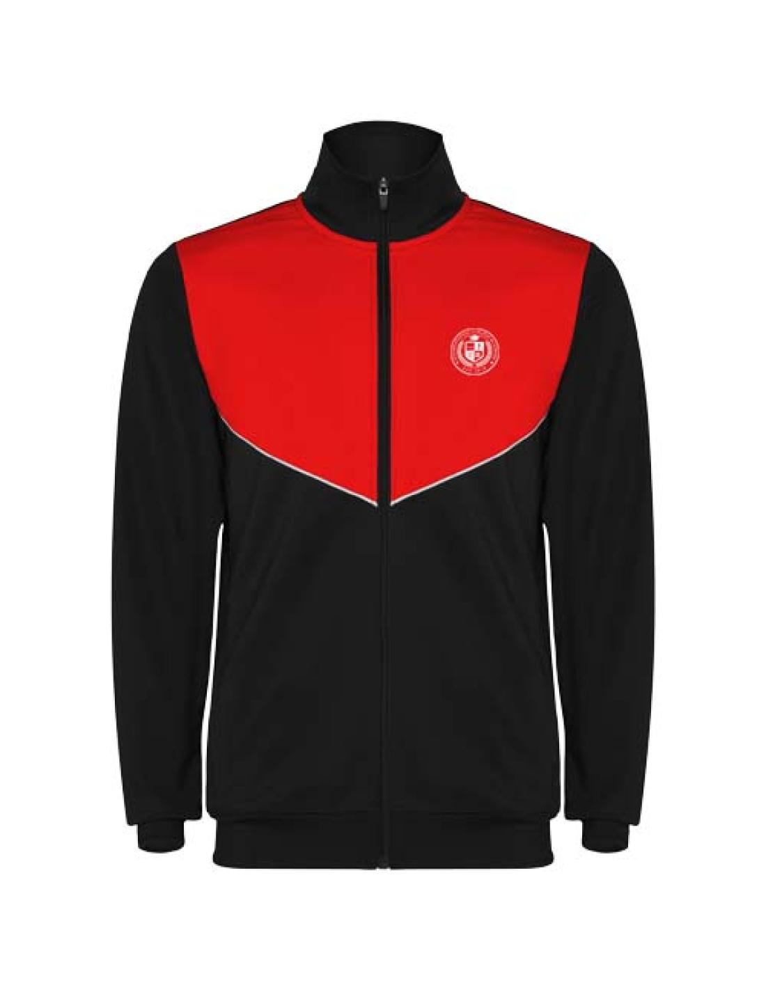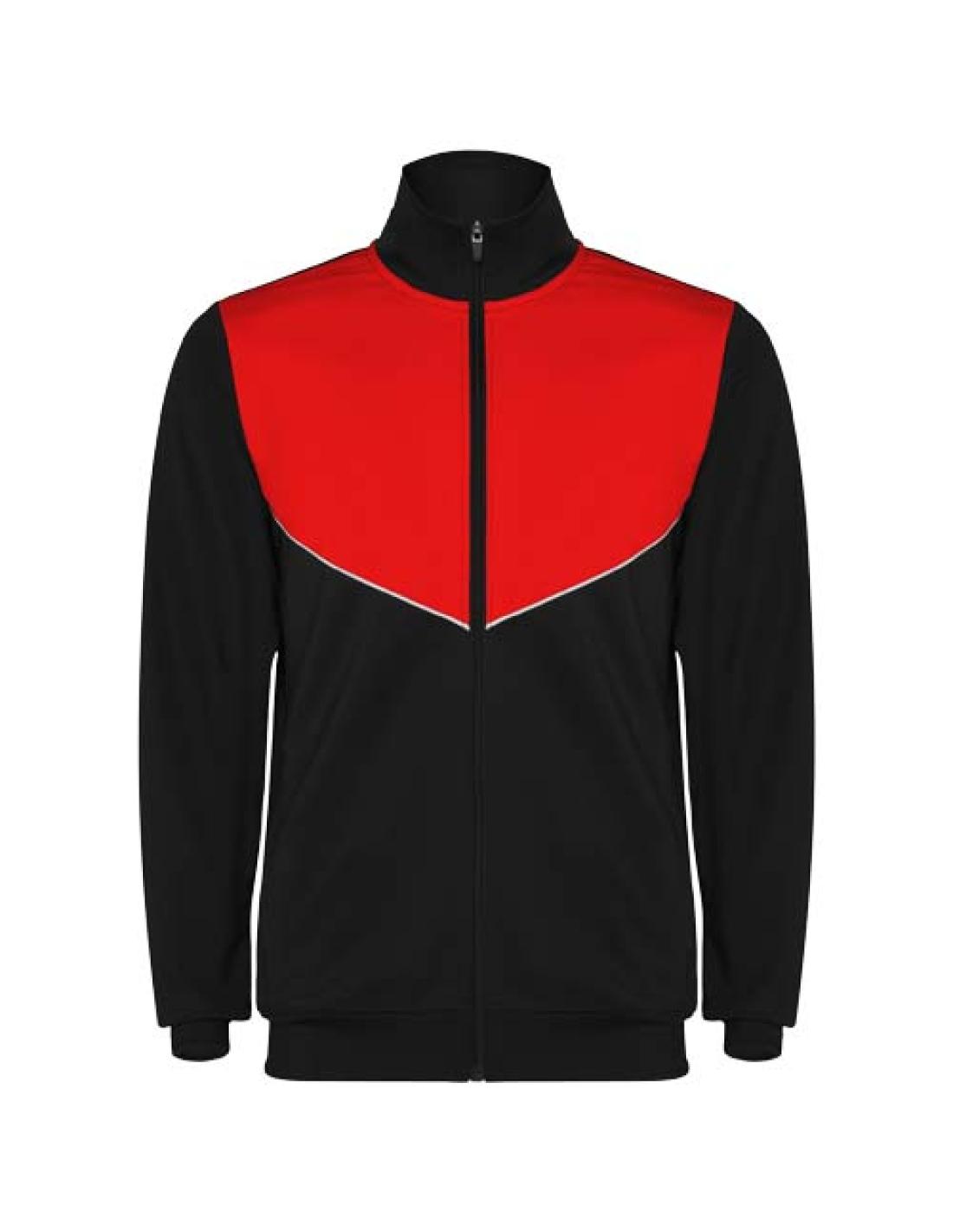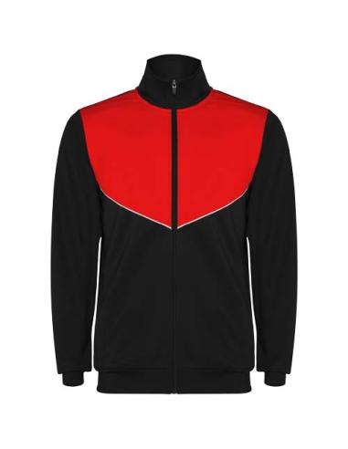Chándal de tejido ligero y elástico. Chaqueta de color contrastado y ribetes de costura en el pecho. Cuello alto con costuras en contraste. Cremallera delantera central. Bolsillos laterales. Puños y cintura de canalé 2 × 2. Pantalón con cintura elástica y cordón. Pieza lateral en contraste con ribete de costura. Dobladillo con cremallera.