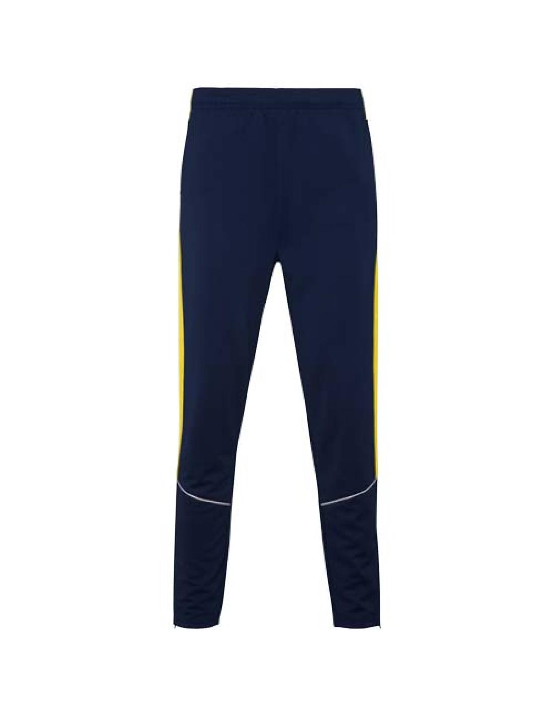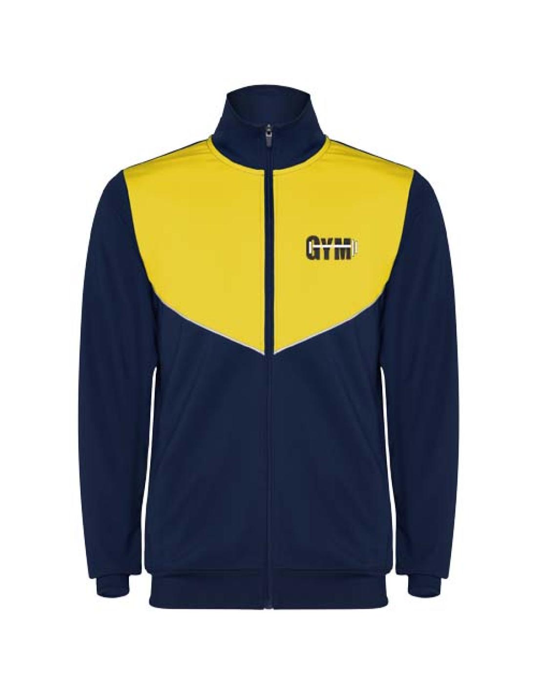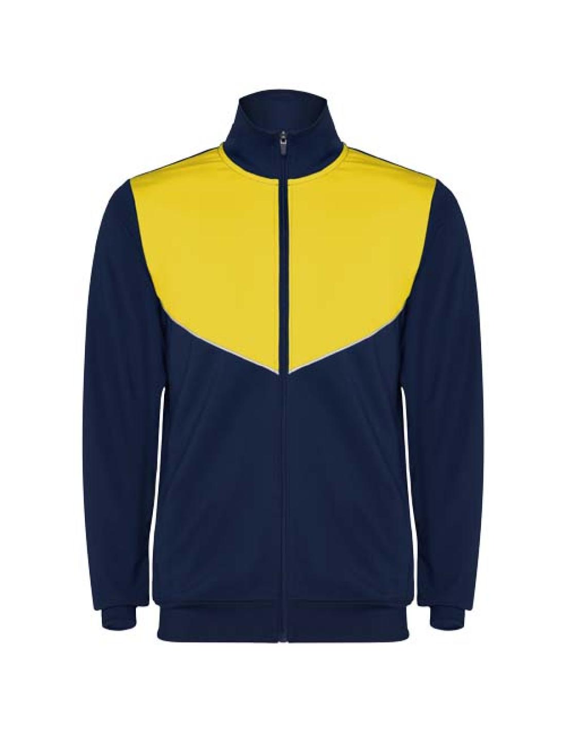 Chándal de tejido ligero y elástico. Chaqueta de color contrastado y ribetes de costura en el pecho. Cuello alto con costuras en contraste. Cremallera delantera central. Bolsillos laterales. Puños y cintura de canalé 2 × 2. Pantalón con cintura elástica y cordón. Pieza lateral en contraste con ribete de costura. Dobladillo con cremallera.