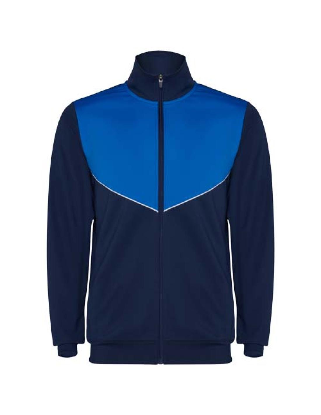 Chándal de tejido ligero y elástico. Chaqueta de color contrastado y ribetes de costura en el pecho. Cuello alto con costuras en contraste. Cremallera delantera central. Bolsillos laterales. Puños y cintura de canalé 2 × 2. Pantalón con cintura elástica y cordón. Pieza lateral en contraste con ribete de costura. Dobladillo con cremallera.