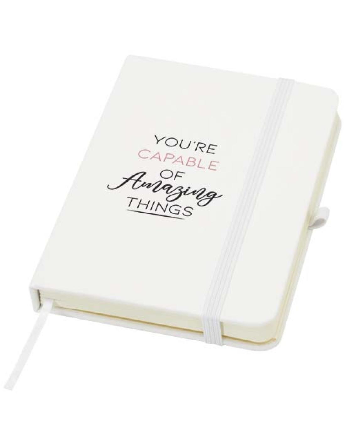 La libreta de tapa dura "Spectrum Plus" A6 con esquinas redondeadas no solo es un artículo de oficina esencial, sino también una gran oportunidad para promocionar tu marca. La libreta de cartón tiene una tapa de tacto suave y 80 hojas rayadas de color crema de 70 g/m², ideales para anotar ideas rápidas o notas largas. La libreta tiene un soporte para bolígrafo, cierre elástico, marcador de cinta y bolsillo acordeón.