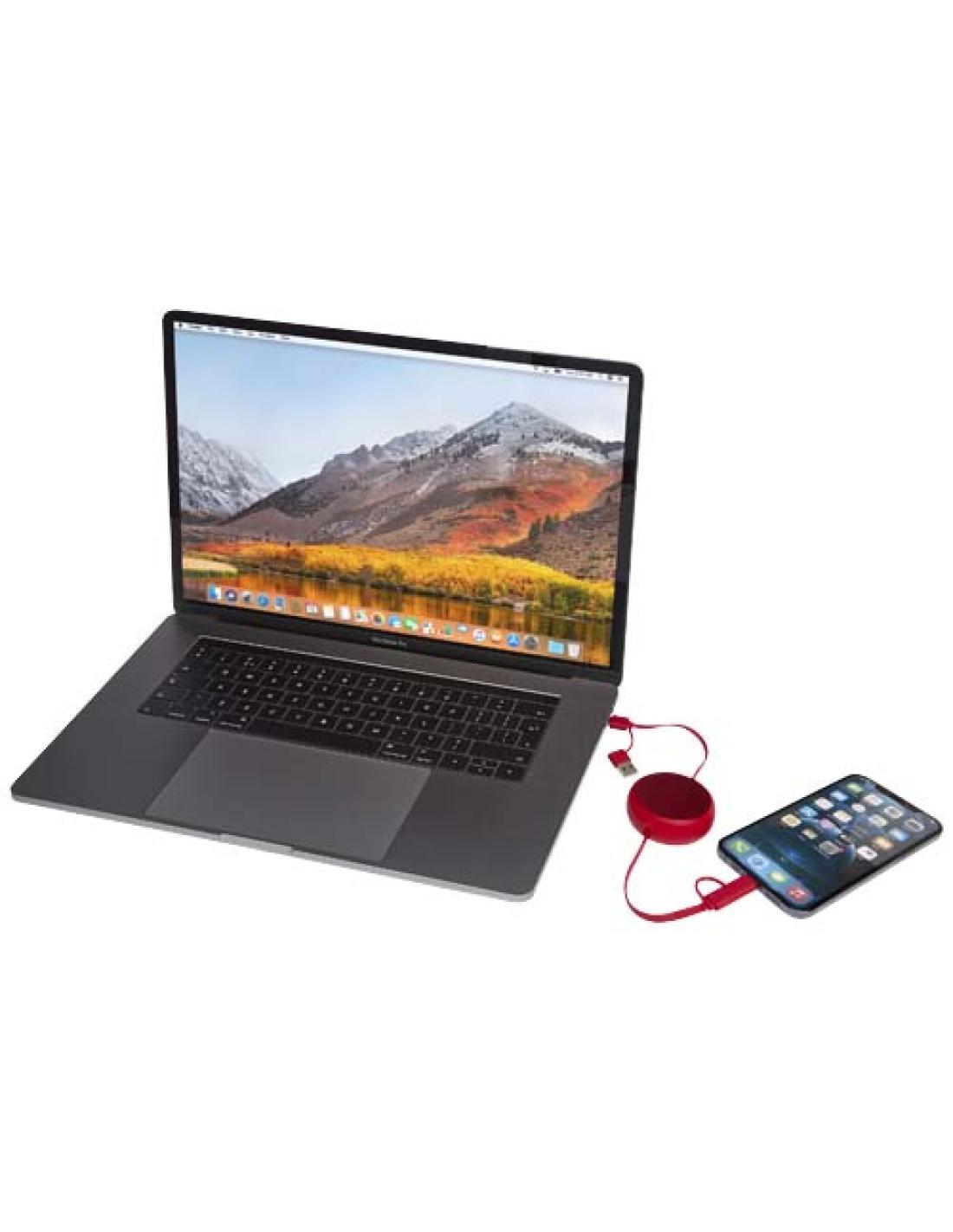 El cable 5 en 1 de sincronización de datos y de carga rápida de 45 W retráctil "Alasia" está hecho de plástico reciclado con un elemento de aluminio reciclado duradero y elegante que lo convierte en una solución de carga elegante y más responsable. El cable cuenta con un conector de entrada USB A y otro tipo C, además de un conector de salida tipo C 2 en 1 y un conector combinado Lightning/Micro USB. USB C a USB C proporciona una potencia de salida de 45 W como máximo, USB A a USB C de 24 W como máximo y todas las demás opciones de conexión de 15 W como máximo. Compatible con CarPlay y Android Autoy también cuenta con un soporte para teléfono integrado para mayor comodidad. Ya sea en casa, en la oficina o en movimiento, el cable "Alasia" ofrece rendimiento y estilo en un paquete compacto. Longitud del...