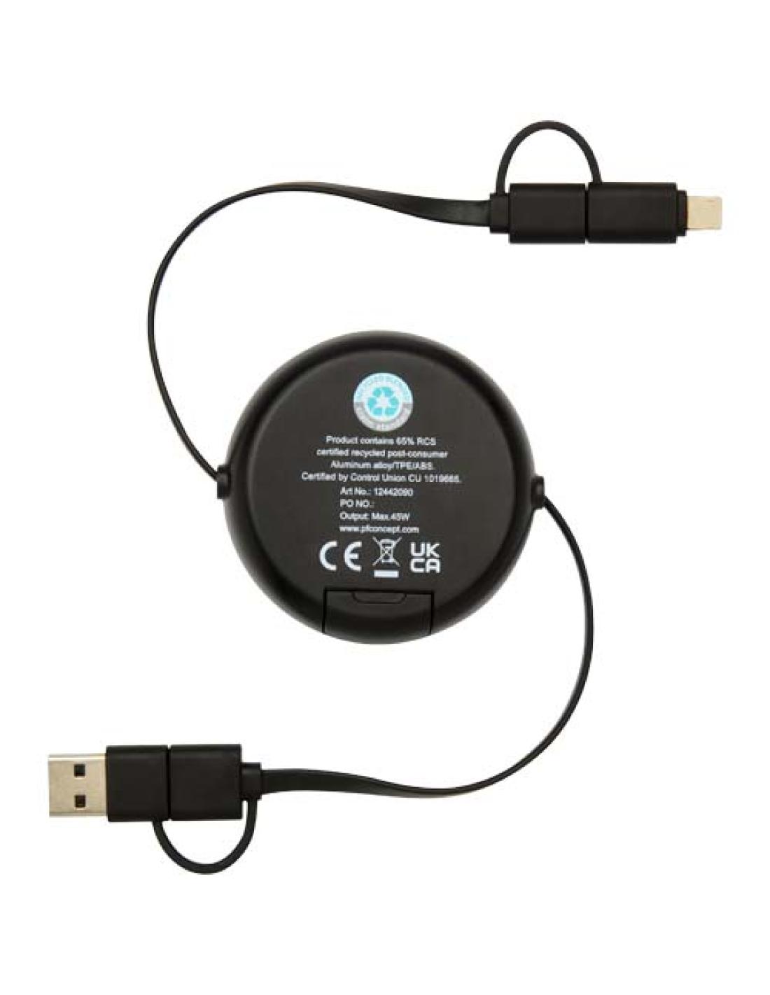 Cable retráctil 5 en 1 de 100 cm de plástico reciclado y aluminio para sincronización de datos y carga rápida de 45 W N12024421