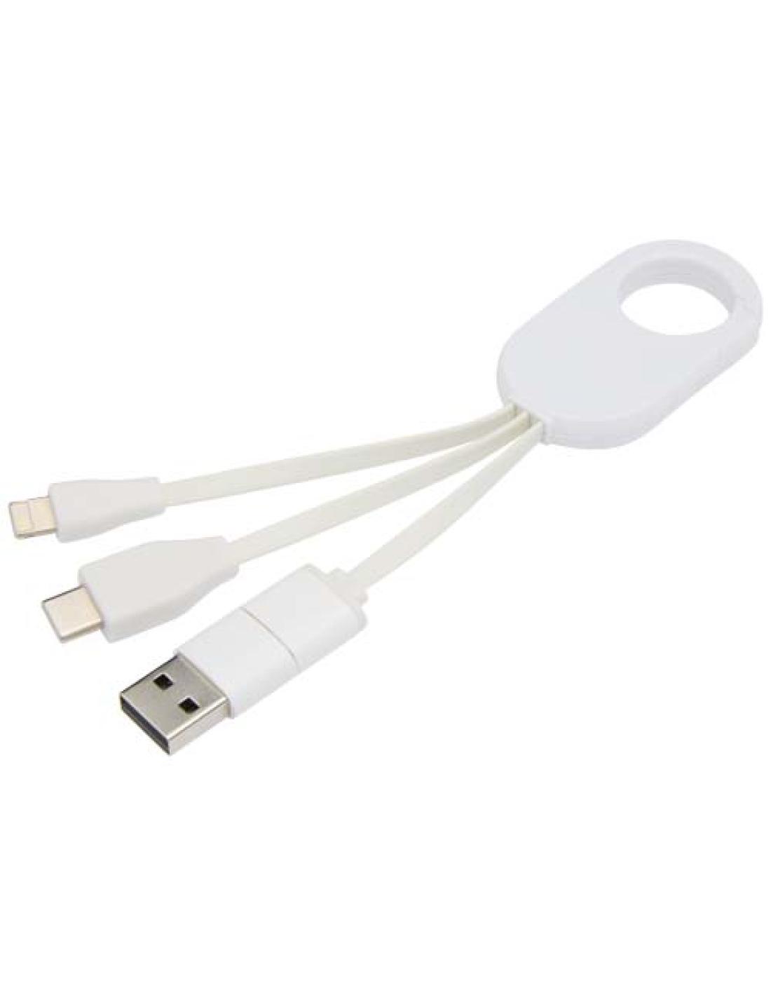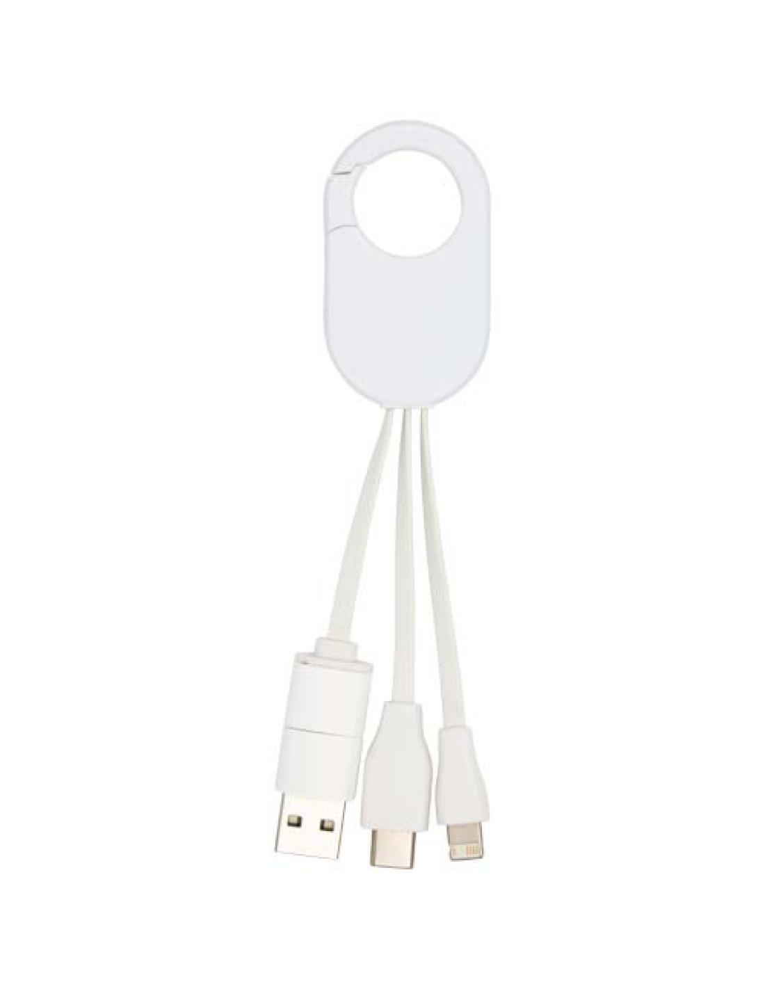 El cable de carga 4 en 1 "Troop" fabricado con plástico reciclado dispone de conectores de entrada USB A y Tipo C, además de conectores de salida combinados Tipo C y Lightning/Micro USB, lo que permite cargar la mayoría de smartphones, cámaras, baterías externas y auriculares. El mosquetón incorporado permite engancharlo con facilidad a un bolso o llavero, para que siempre puedas recargar tus dispositivos en cualquier lugar.