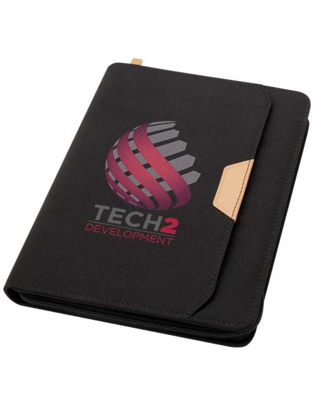 El portafolios A5 "Nomumi" con esquinas redondeadas es un práctico artículo de oficina fabricado con plástico reciclado. Cuenta con 64 hojas rayadas color crema de 80 g/m2, cierre de cremallera, soporte para bolígrafo y bolsillo en acordeón.