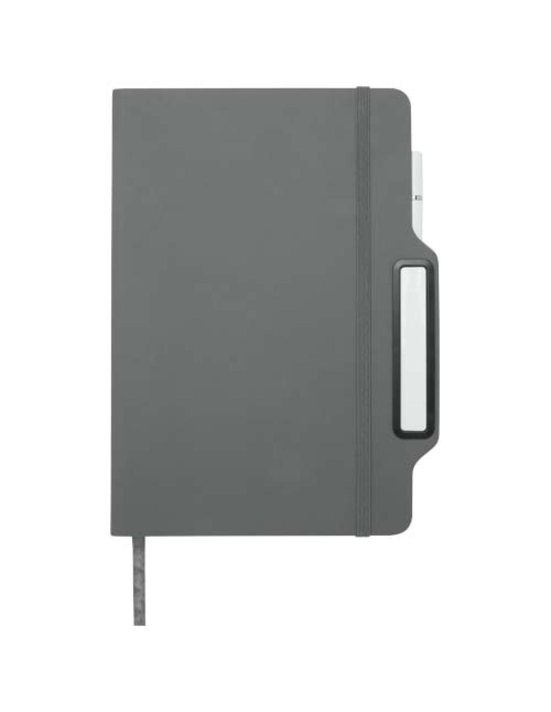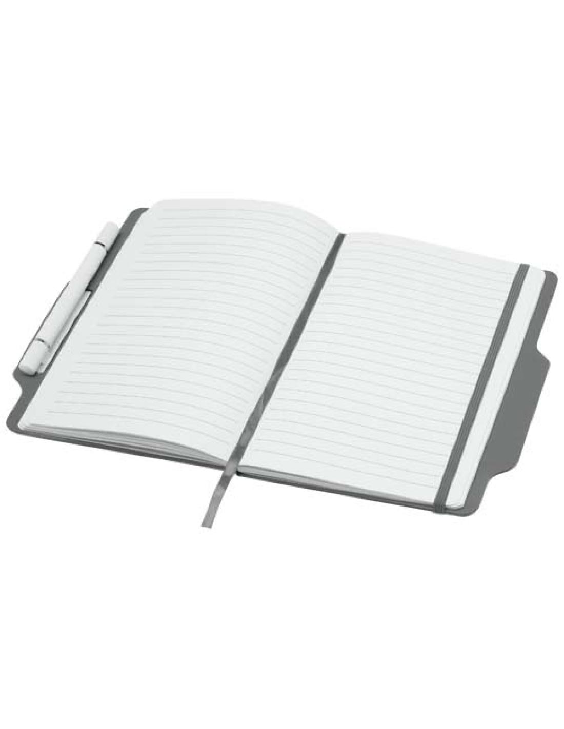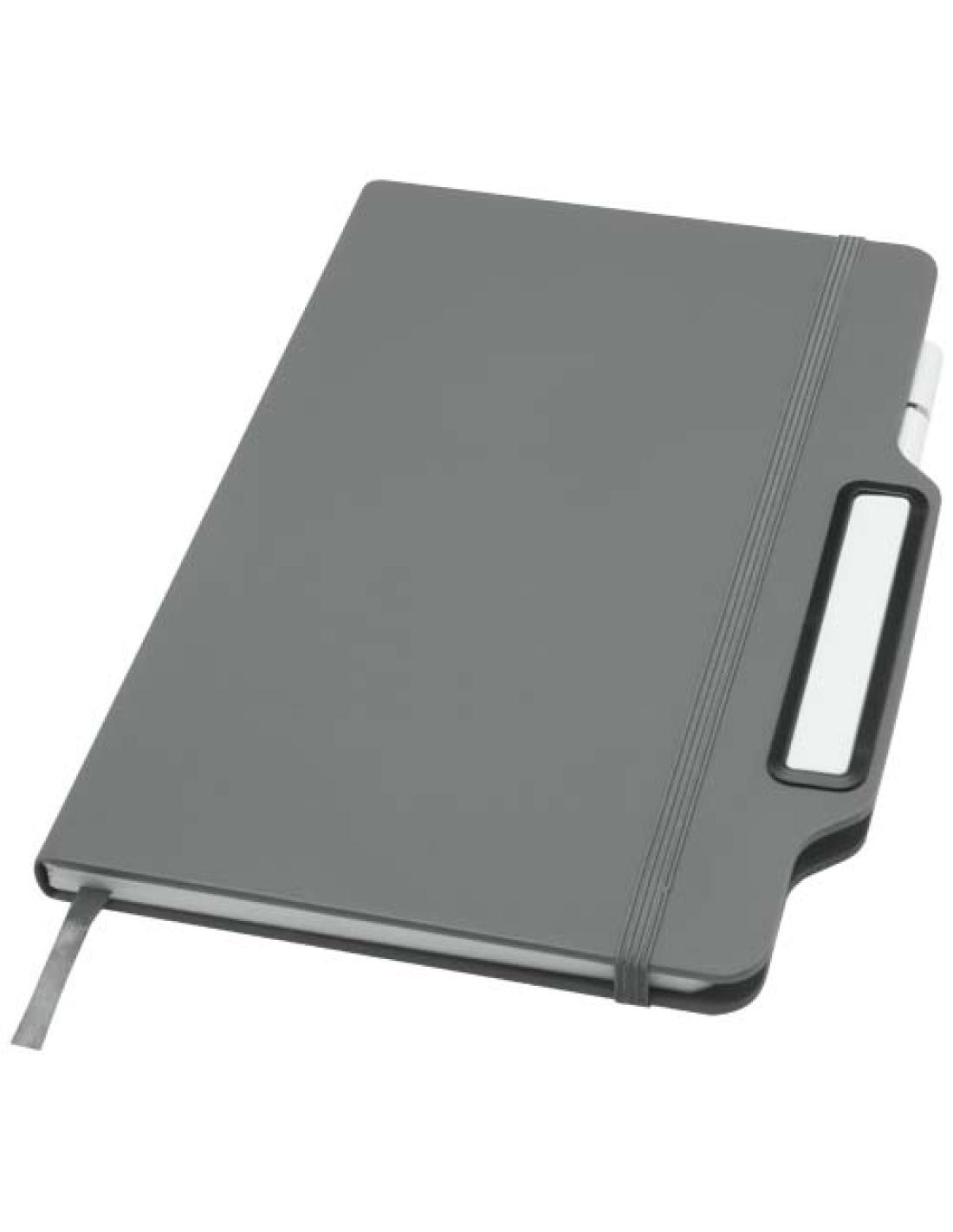 La libreta de tapa dura A5 "Nexus" con combinación de bolígrafo y lápiz cuenta con 80 hojas rayadas en color crema de 70 g/m², esquinas redondeadas, cierre elástico y marcador de cinta. El bolígrafo tiene dos lados: uno es un bolígrafo con tinta negra y el otro es un lápiz. Longitud de escritura del bolígrafo: 1000 metros. Tamaño del plumín: 1,00 mm.
