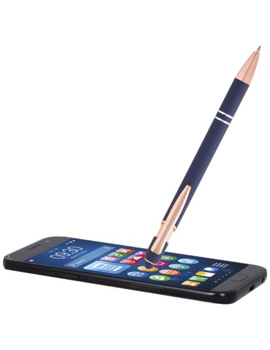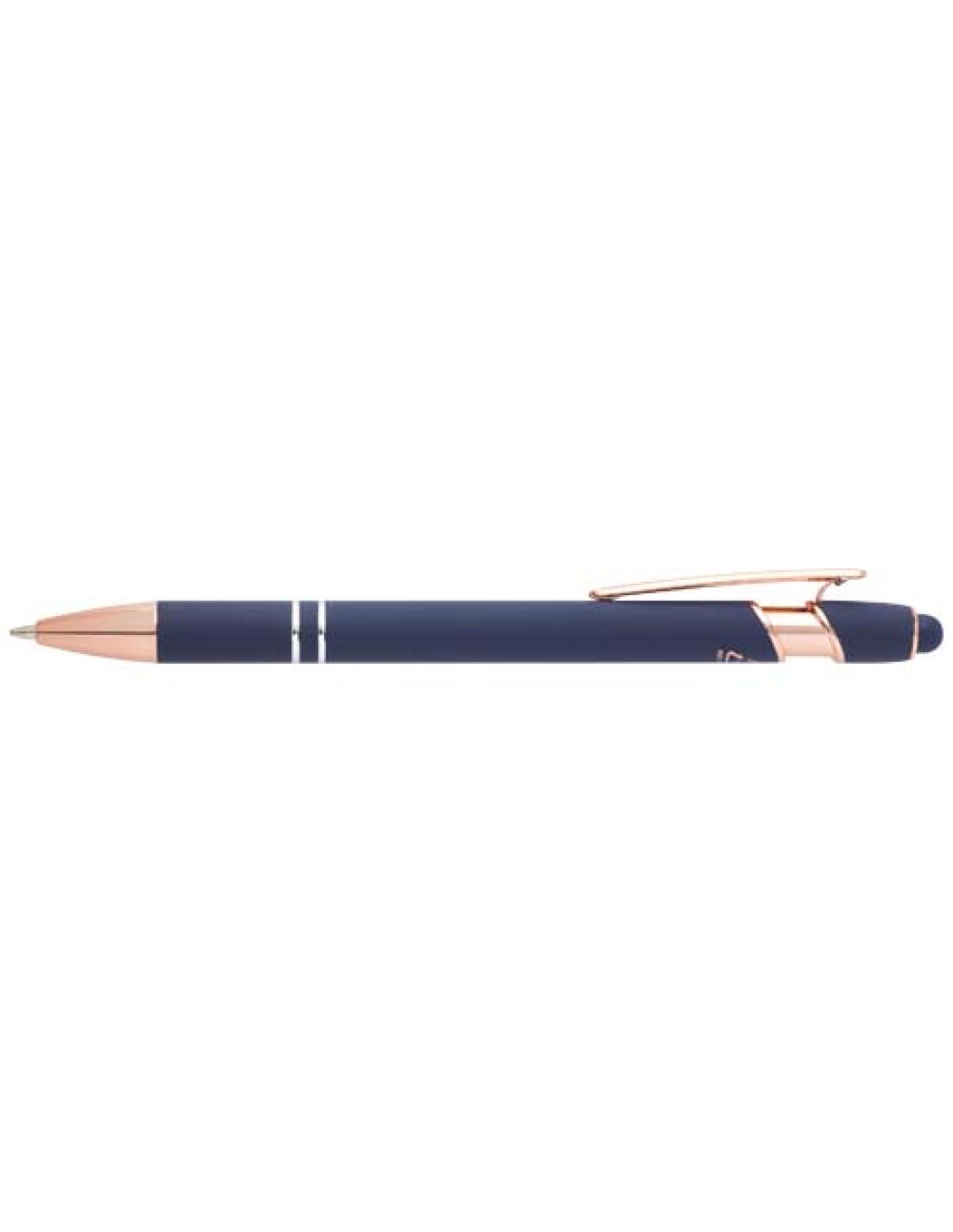 El bolígrafo "Nanna" con acabado en oro rosa tiene un cuerpo de aluminio reciclado y un lápiz táctil de silicona. El aluminio reciclado disminuye la cantidad de residuos en los vertederos y ayuda a conservar los recursos naturales con el objetivo de reducir las emisiones de gases de efecto invernadero. Color de la tinta: Azul. Longitud de escritura: 800 metros. Tamaño del plumín: 1,0 mm.