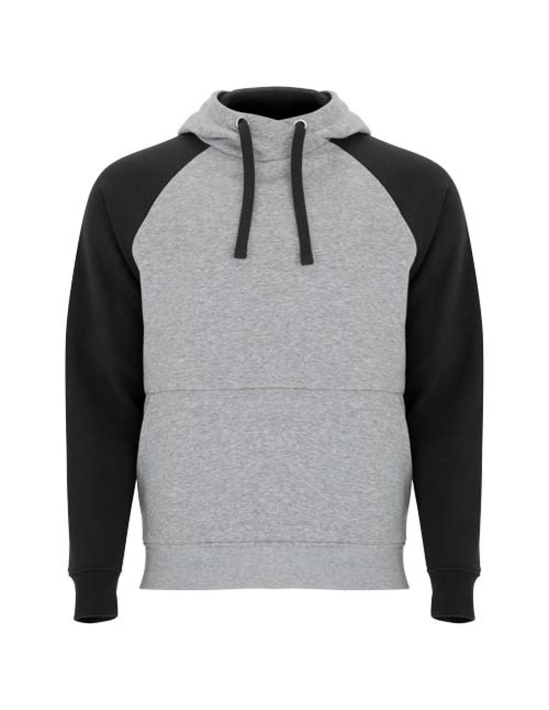 Sudadera con capucha bicolor unisex. Capucha con cuello cruzado y ojales metálicos. Interior de la capucha, cordón de ajuste y mangas raglán en contraste. Bolsillo tipo canguro. Puños y dobladillo de punto de elastano 1× 1. Etiqueta extraíble.