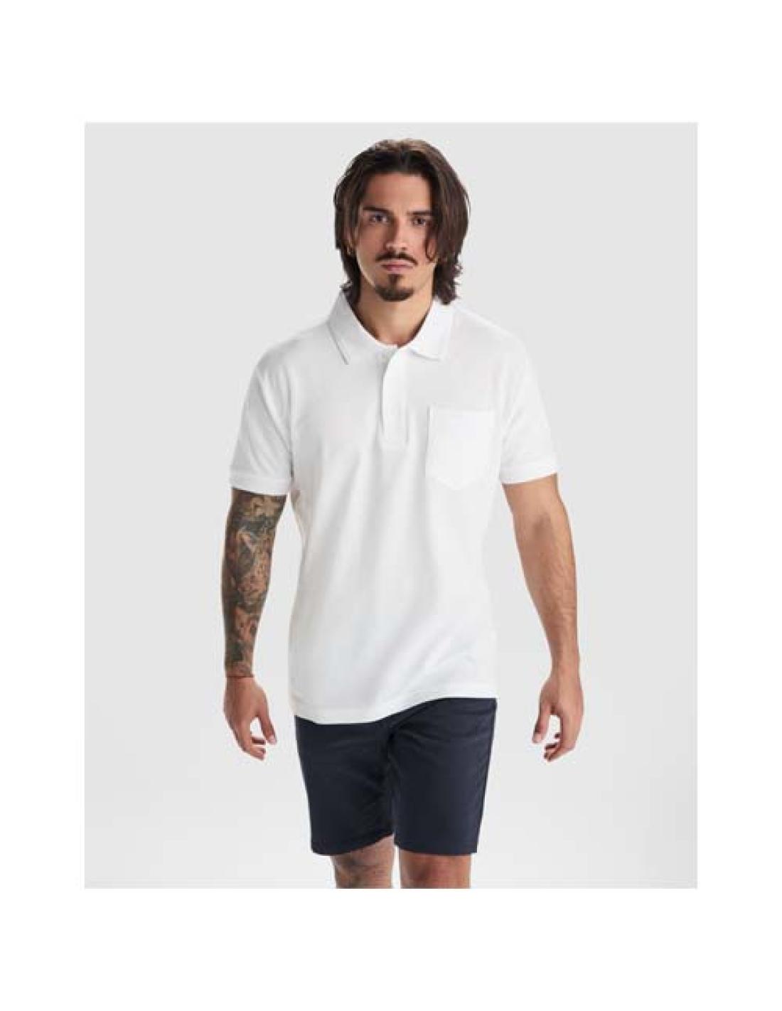 Polo de manga corta con bolsillo en la parte izquierda del pecho. Cuello y puños en tejido acanalado 1 × 1 con detalle. Tapeta de 3 botones. Costuras cubiertas reforzadas en el cuello. Etiqueta extraíble. Tratamiento antibolitas.