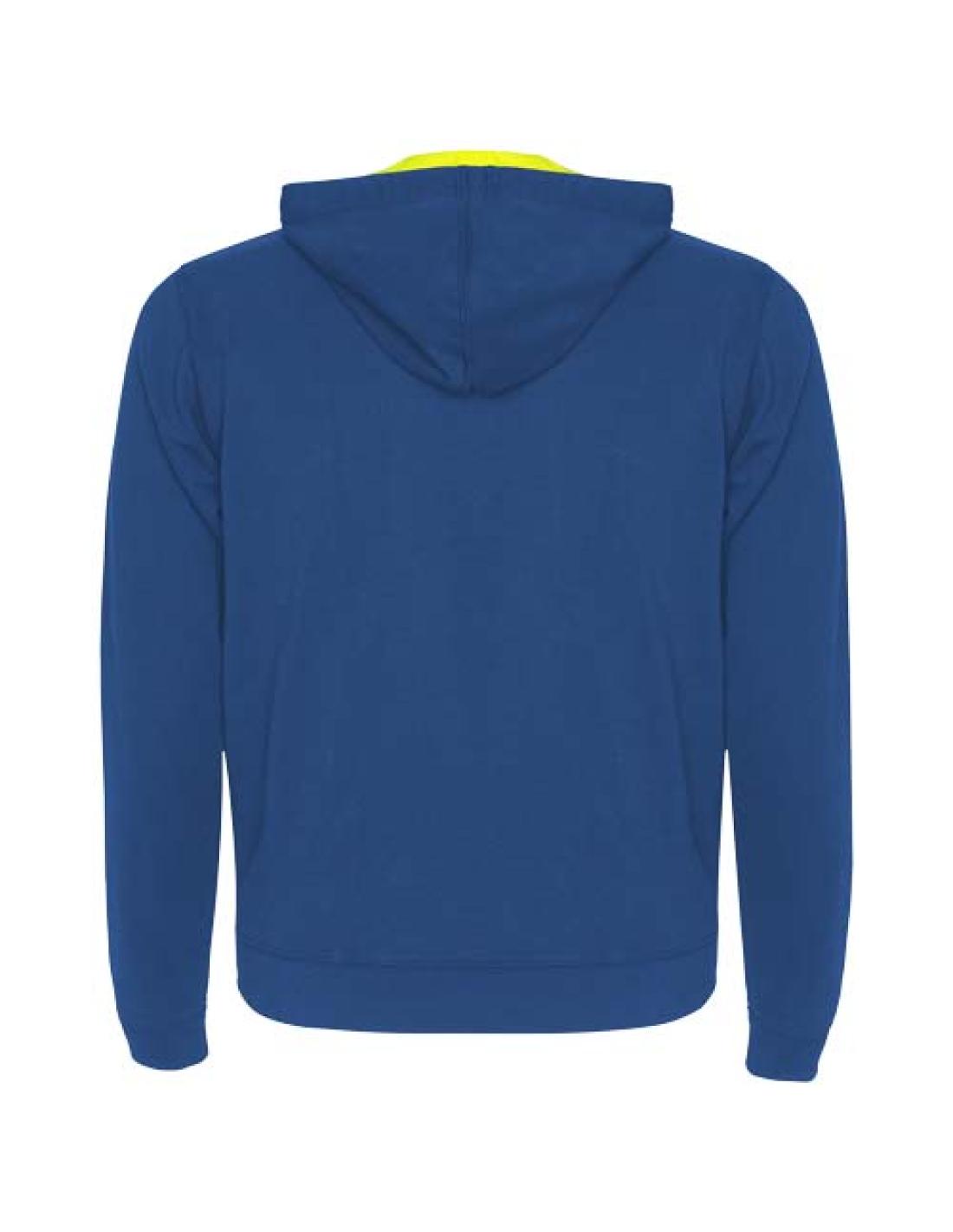 Chaqueta sudadera de vellón sin cepillar con detalles en color flúor. Cremallera central con tirador en contraste. Capucha con forro de tejido de poliéster microperforado y color flúor en contraste. Cordón de ajuste y ojales metálicos de color flúor en contraste. Puños y cintura de canalé 1 × 1. Dos bolsillos delanteros con ribete ancho. Costuras cubiertas reforzadas en el interior del cuello. Etiqueta extraíble.