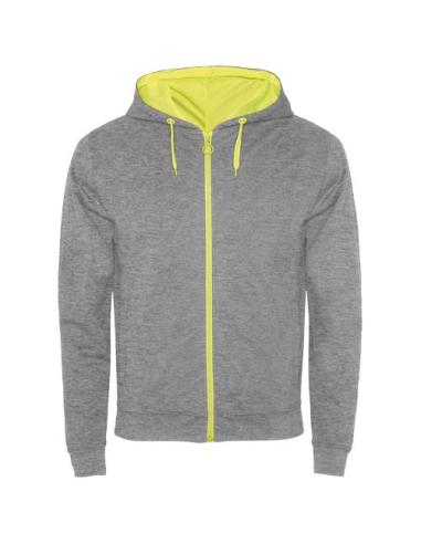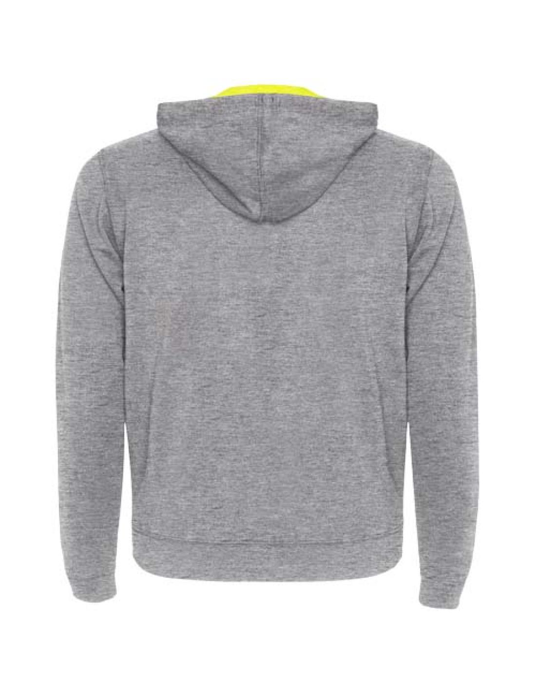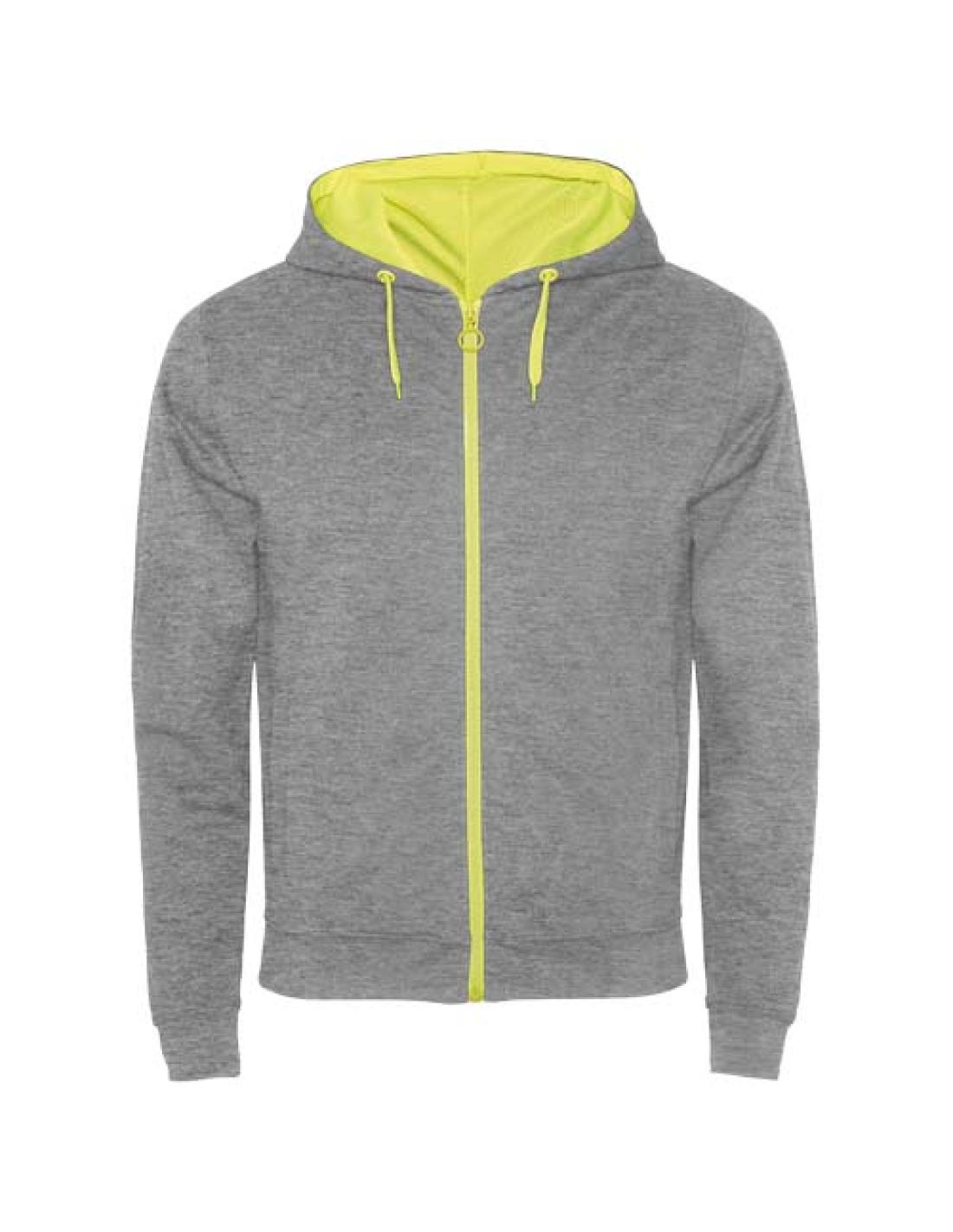 Chaqueta sudadera de vellón sin cepillar con detalles en color flúor. Cremallera central con tirador en contraste. Capucha con forro de tejido de poliéster microperforado y color flúor en contraste. Cordón de ajuste y ojales metálicos de color flúor en contraste. Puños y cintura de canalé 1 × 1. Dos bolsillos delanteros con ribete ancho. Costuras cubiertas reforzadas en el interior del cuello. Etiqueta extraíble.