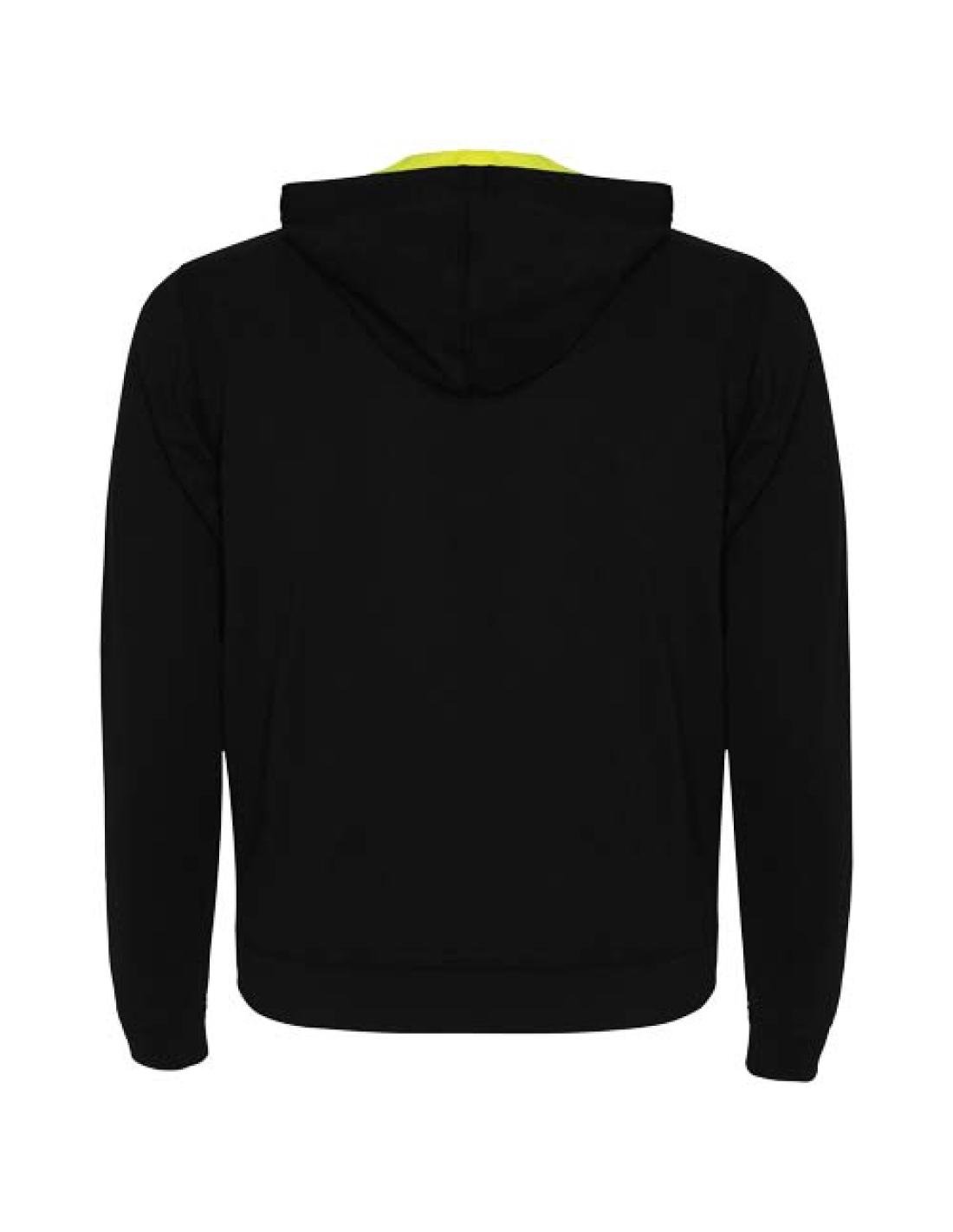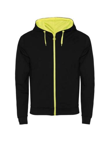 Chaqueta sudadera de vellón sin cepillar con detalles en color flúor. Cremallera central con tirador en contraste. Capucha con forro de tejido de poliéster microperforado y color flúor en contraste. Cordón de ajuste y ojales metálicos de color flúor en contraste. Puños y cintura de canalé 1 × 1. Dos bolsillos delanteros con ribete ancho. Costuras cubiertas reforzadas en el interior del cuello. Etiqueta extraíble.