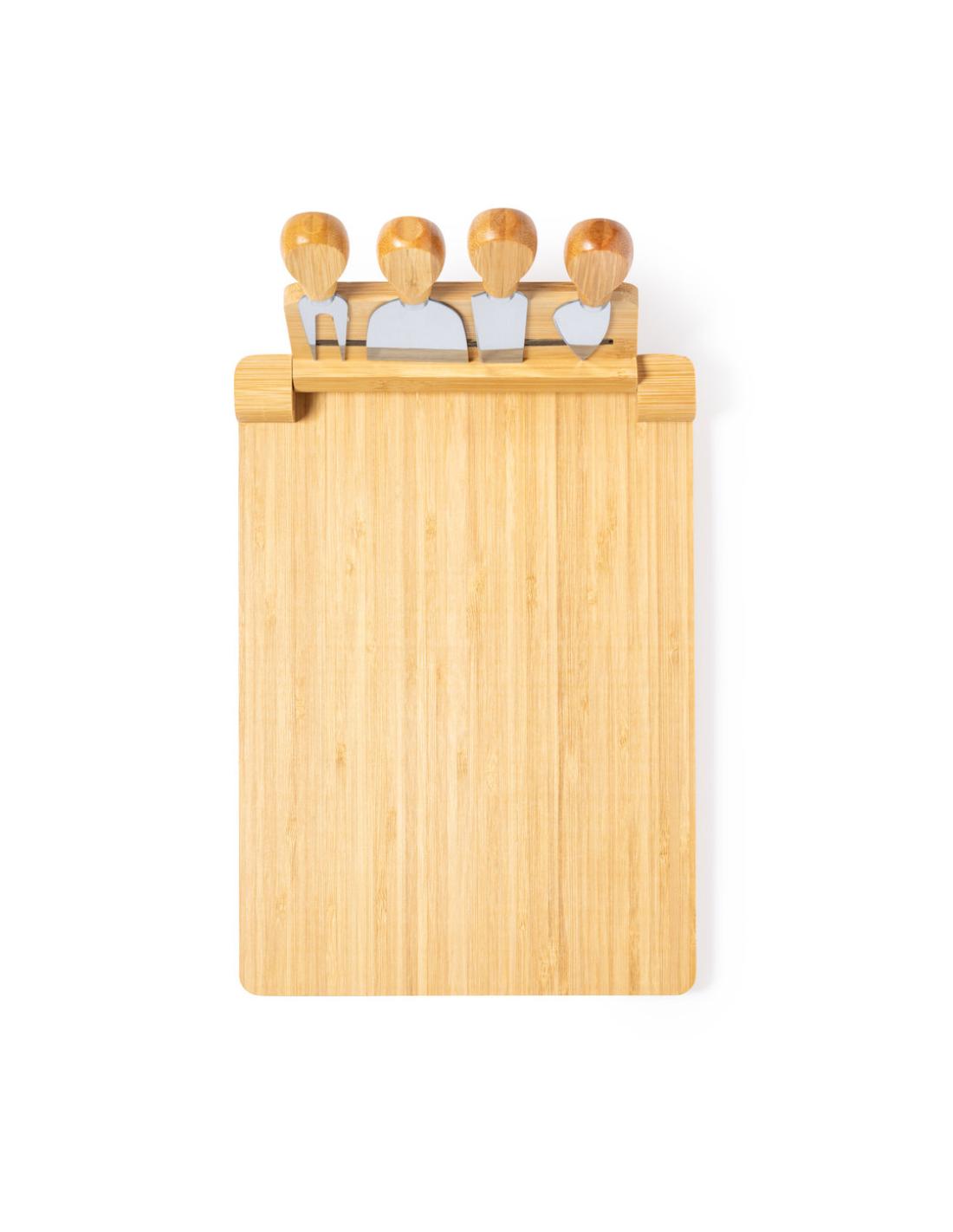 Original set de quesos, con soporte para accesorios magnético y plegable. Tabla de corte y presentación fabricada en bambú y en formato rectangular. Accesorios en acero inox con mango en bambú. Presentado en caja individual de diseño kraft.