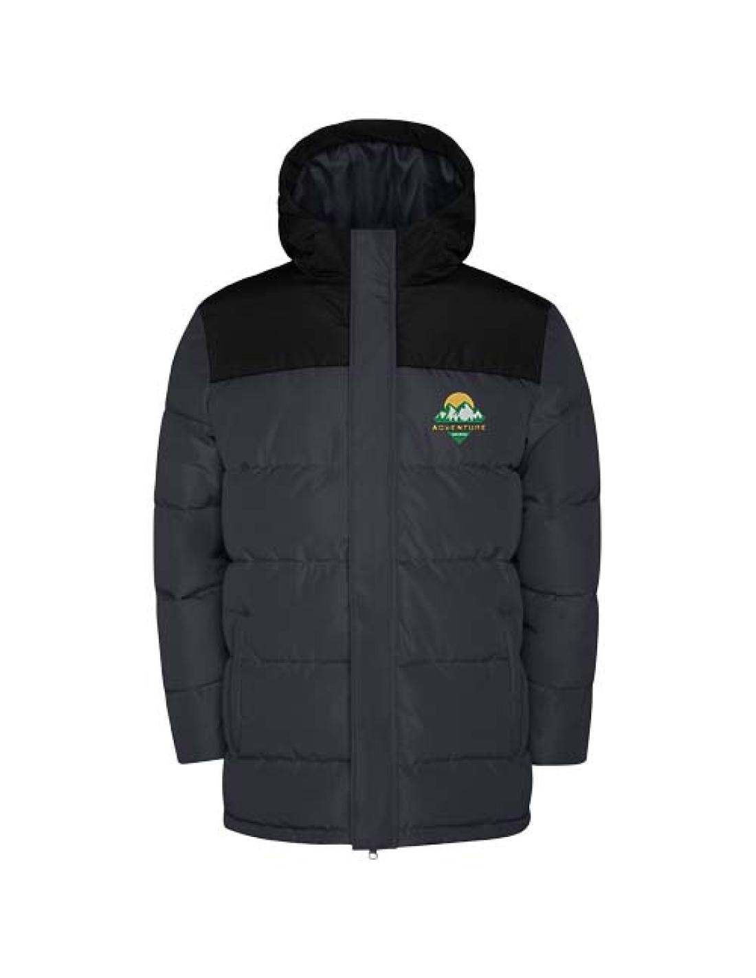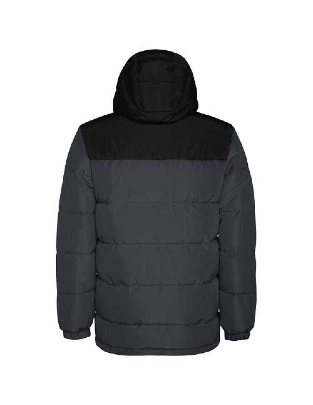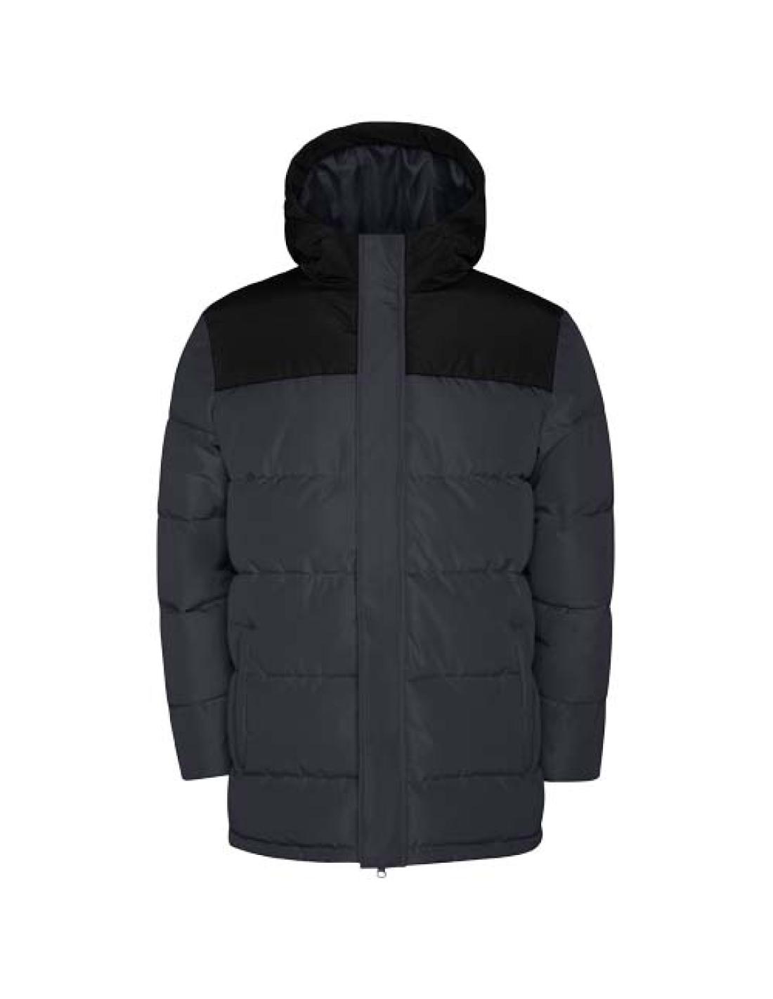 Chaqueta acolchada con capucha fija. Cremallera frontal cubierta con tapeta. Protector de barbilla. Dos bolsillos laterales con cremallera. Bajos ajustados elásticos.