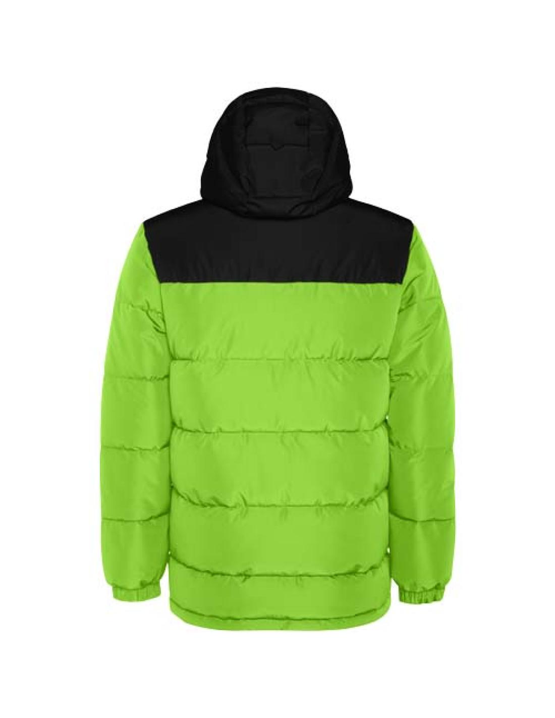 Chaqueta acolchada con capucha fija. Cremallera frontal cubierta con tapeta. Protector de barbilla. Dos bolsillos laterales con cremallera. Bajos ajustados elásticos.