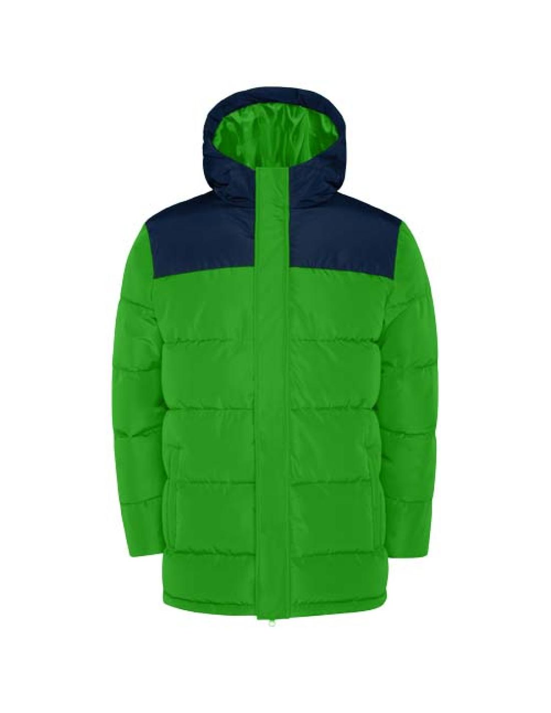 Chaqueta acolchada con capucha fija. Cremallera frontal cubierta con tapeta. Protector de barbilla. Dos bolsillos laterales con cremallera. Bajos ajustados elásticos.