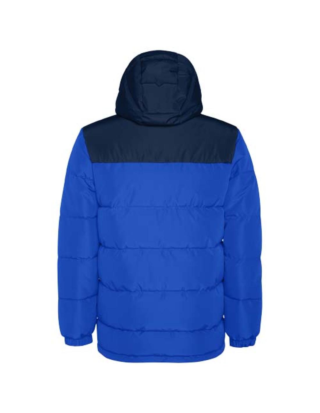 Chaqueta acolchada con capucha fija. Cremallera frontal cubierta con tapeta. Protector de barbilla. Dos bolsillos laterales con cremallera. Bajos ajustados elásticos.