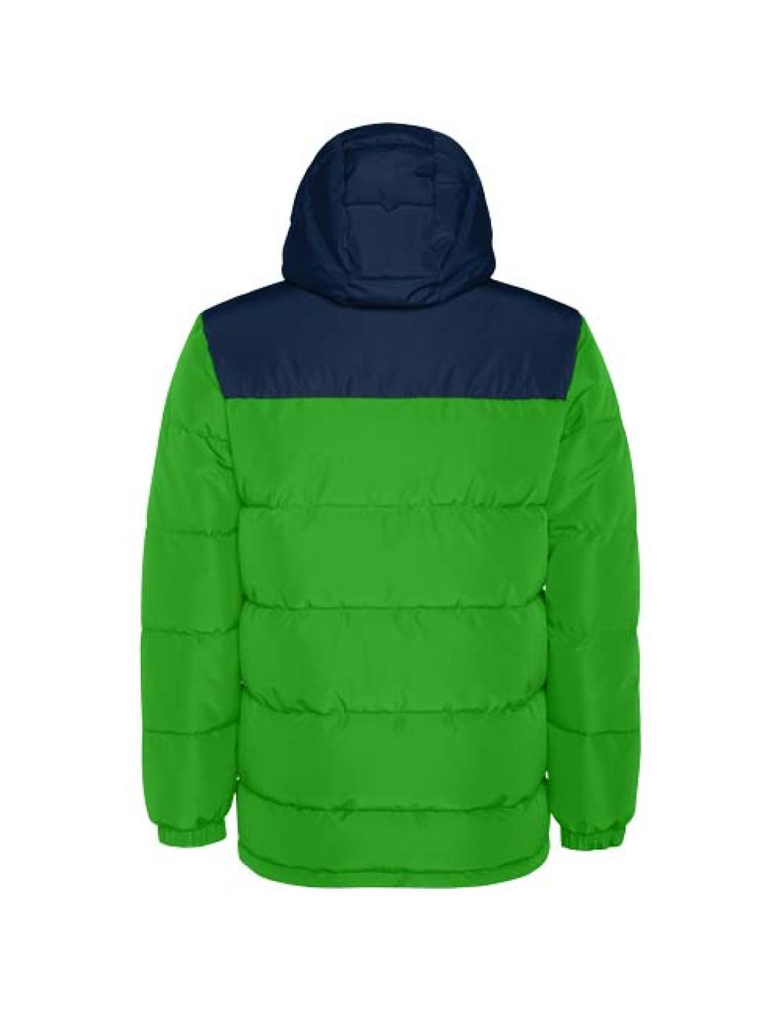 Chaqueta acolchada con capucha fija. Cremallera frontal cubierta con tapeta. Protector de barbilla. Dos bolsillos laterales con cremallera. Bajos ajustados elásticos.