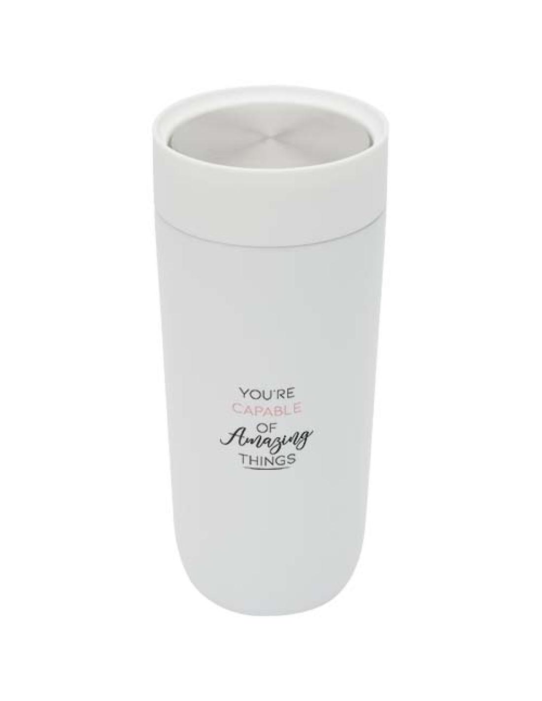 Vaso de alta calidad con un práctico mecanismo de apertura de acero inoxidable que permite abrirlo con una sola mano. Cuerpo de acero inoxidable con certificado RCS y revestimiento duradero. La tapa está fabricada en acero inoxidable con certificado RCS y plástico PP. Cobreado y revestimiento cerámico. Se adapta a los portavasos de coche más comunes. Mantiene las bebidas 12 horas calientes o 24 horas frías. Se presenta en una caja de regalo de cartón reciclado. Capacidad: 350 ml.