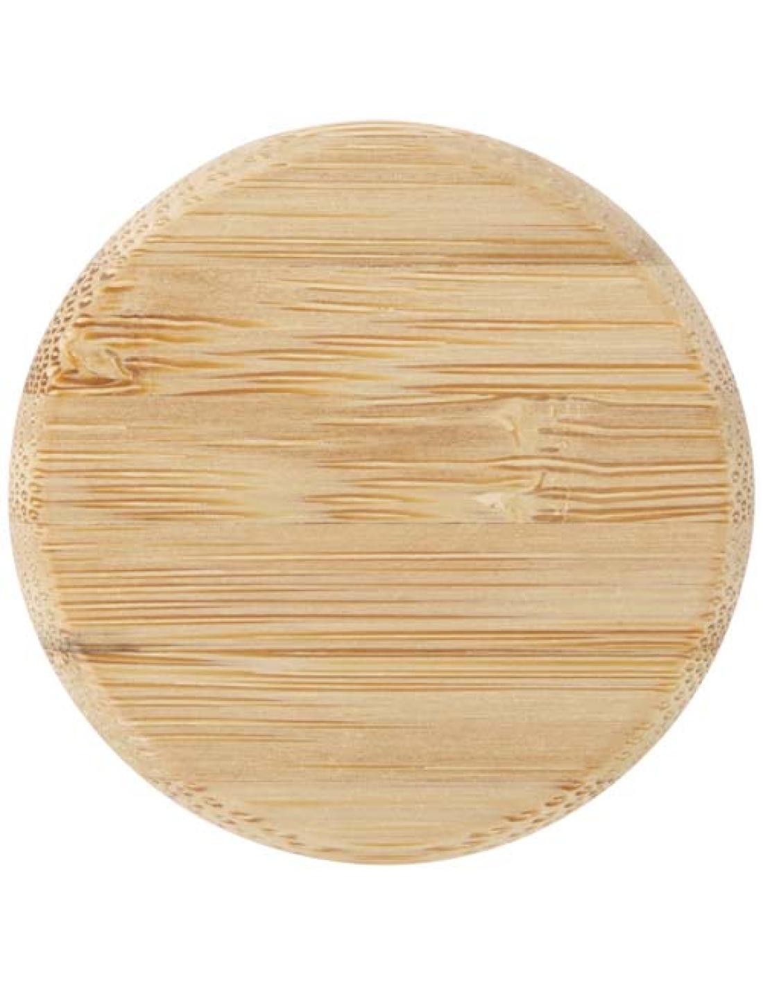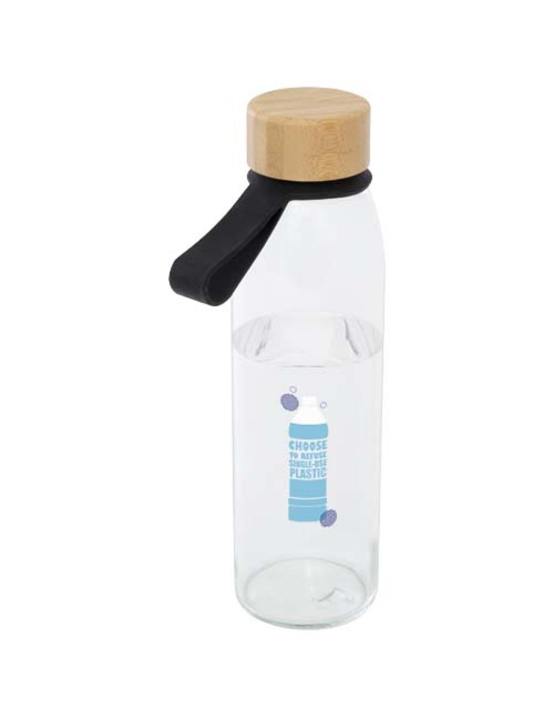 Botella de vidrio de una sola pared con tapón de rosca de bambú procedente de fuentes más sostenibles y socialmente responsables. Viene con una cómoda correa de silicona para facilitar su transporte. Se presenta en una caja de regalo de cartón reciclado. Capacidad: 500 ml.