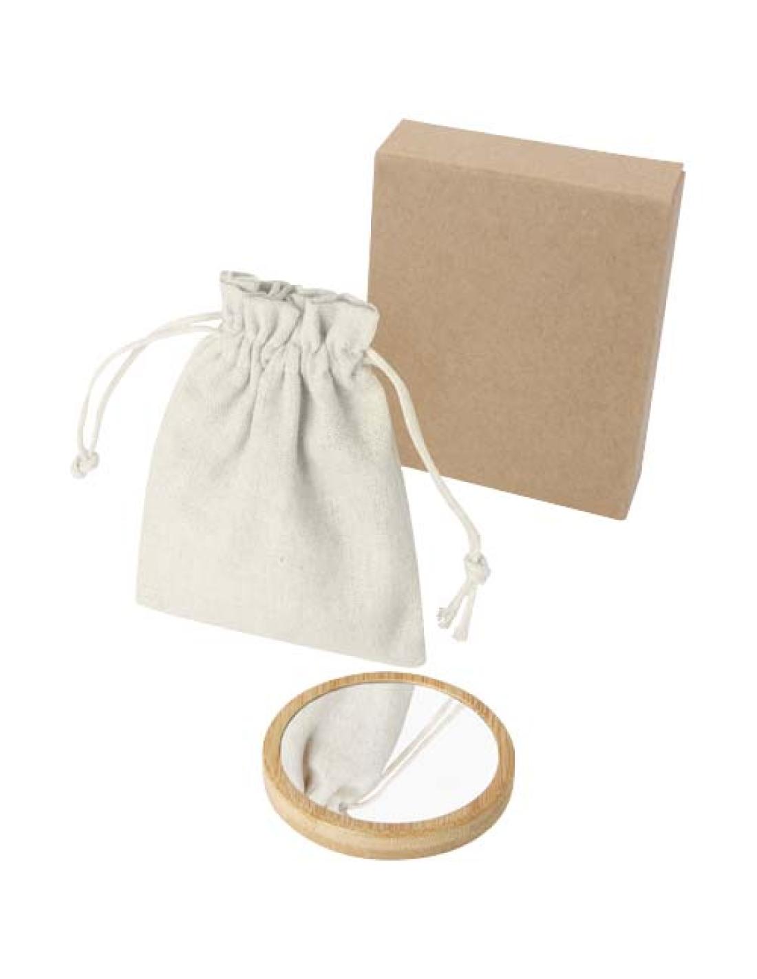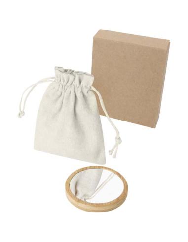 Espejo redondo de bambú con un aspecto natural y elegante. Se entrega en una bolsa de algodón.