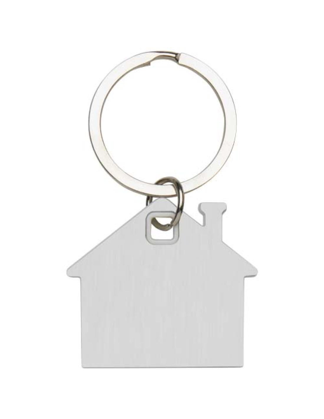 Llavero en forma de casa con una lámina de acero inoxidable de diseño esmerilado por delante y por detrás y un chip de plástico de color en el centro.