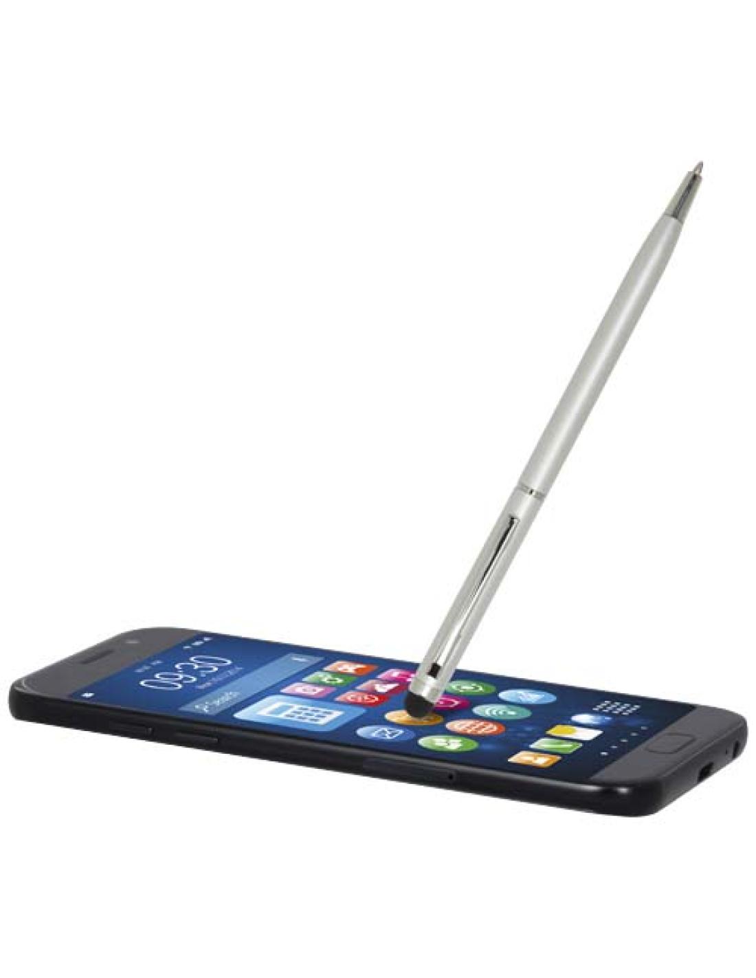 Esta versátil combinación de bolígrafo y puntero está fabricada en aluminio resistente. El bolígrafo proporciona una escritura fluida y el stylus incorporado es perfecto para una navegación precisa en pantallas táctiles. Color de la tinta: Azul. Longitud de escritura: 1000 metros. Tamaño del plumín: 1,0 mm.