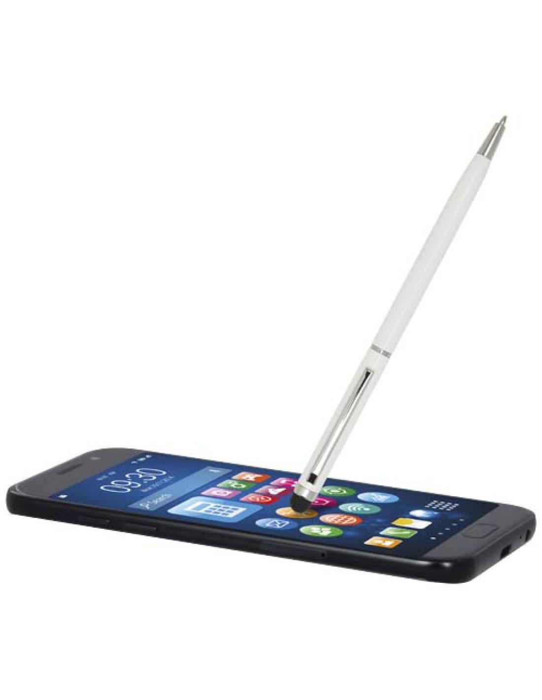Esta versátil combinación de bolígrafo y puntero está fabricada en aluminio resistente. El bolígrafo proporciona una escritura fluida y el stylus incorporado es perfecto para una navegación precisa en pantallas táctiles. Color de la tinta: Azul. Longitud de escritura: 1000 metros. Tamaño del plumín: 1,0 mm.