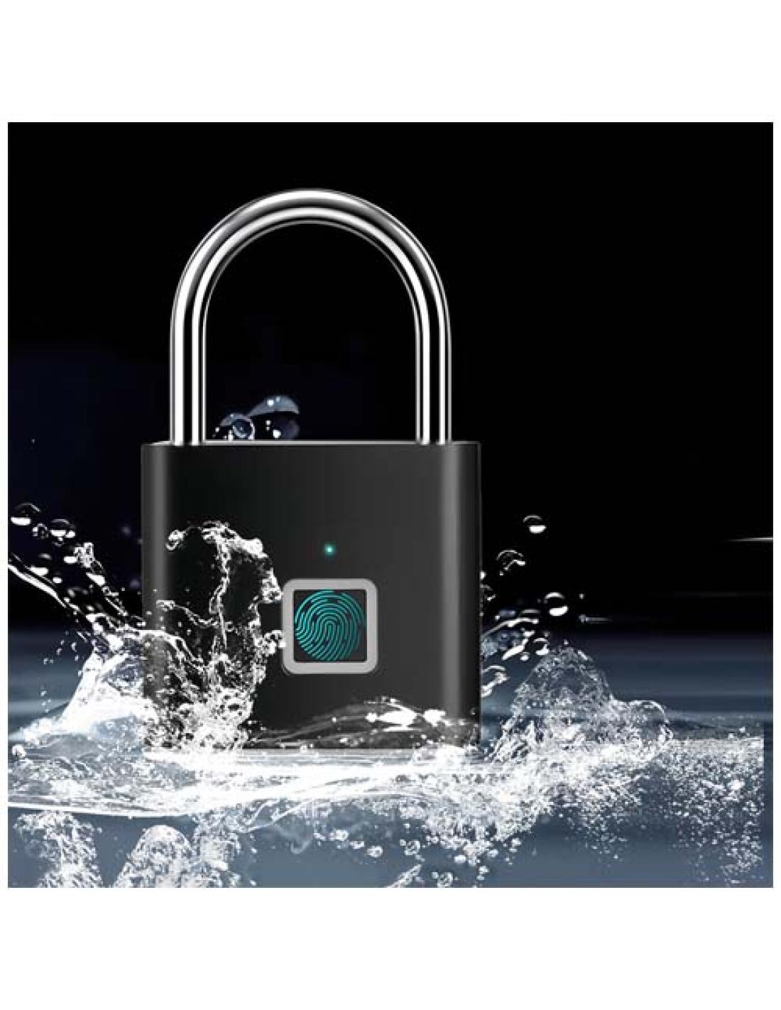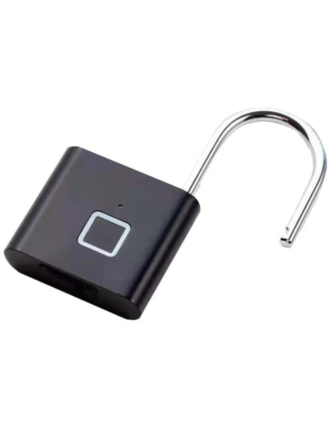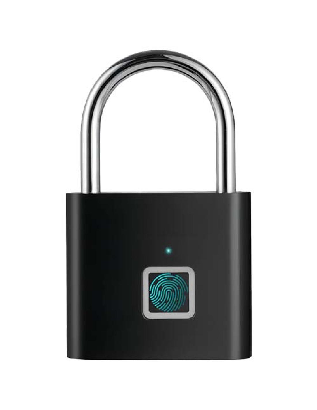 Candado robusto y fácil de usar con sensor de huella dactilar con capacidad para almacenar hasta 10 huellas. La batería dura aproximadamente 6 meses antes de que sea necesario recargarla. Se presenta en una caja de regalo de cartón reciclado (10,8 × 6,9 × 2,9 cm).