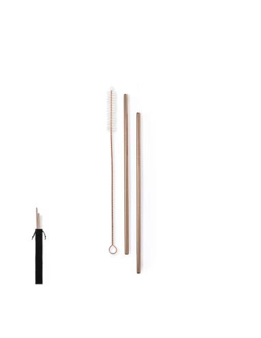Set de pajitas de 2 piezas fabricadas en acero inox con recubrimiento exterior de cobre galvanizado. Con cepillo limpiador incluido y presentadas en funda de antelina negra con cordón de cierre.